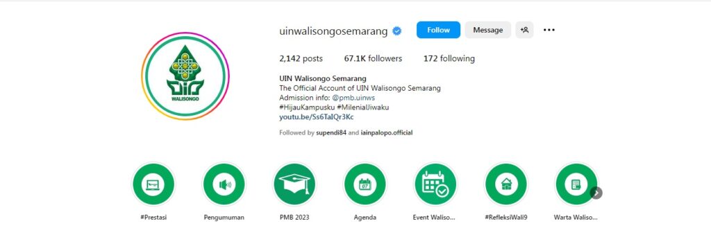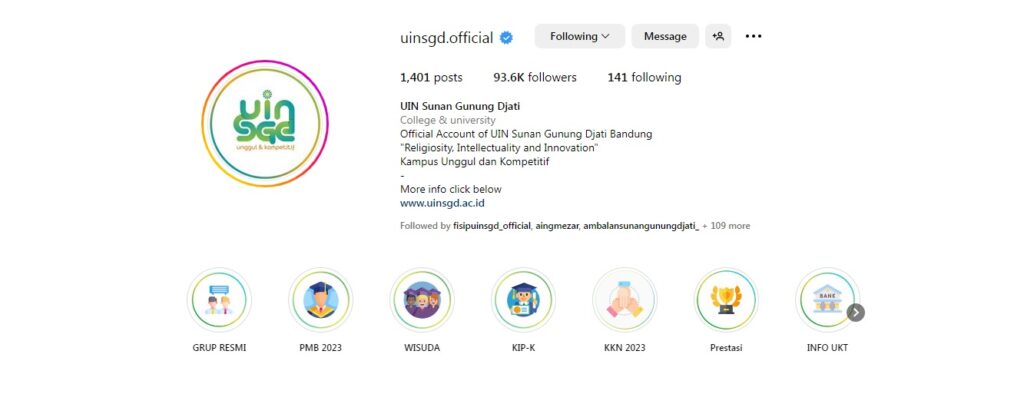 Akun @uinsgd.official dengan 1.401 posting, 93,6 RB pengikut dan 141 mengikuti. @uinsk dengan 3.949 posting, 99,5 RB pengikut dan 227 mengikuti. @uinwalisongosemarang dengan 2.142 posting, 67 RB pengikut dan 172 mengikuti.