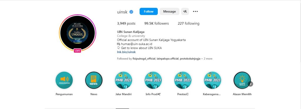 Yaitu UIN Sunan Gunung Djati Bandung (@uinsgd.official), UIN Sunan Kalijaga Yogyakarta (@uinsk) dan UIN Walisongo Semarang (@uinwalisongosemarang).