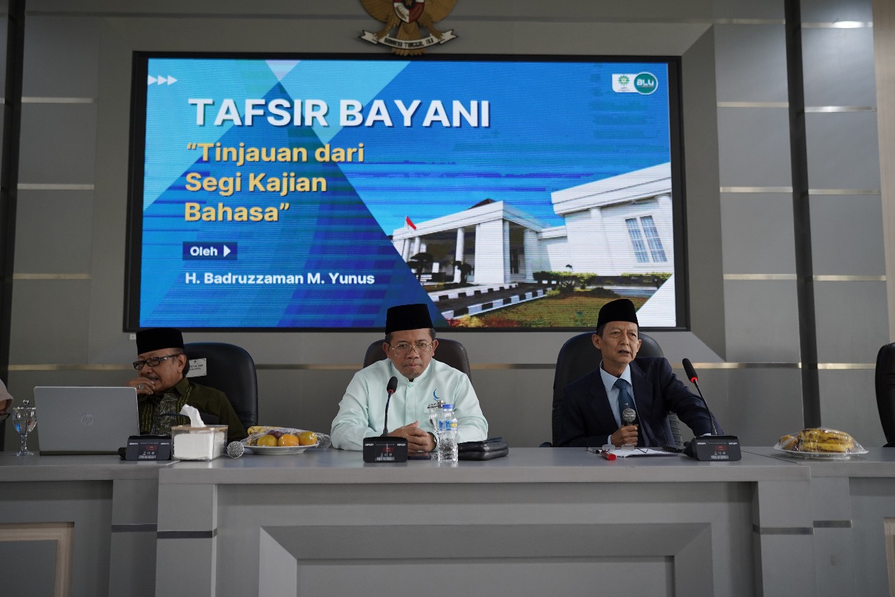 Prof. Badruzzaman M. Yunus menjelaskan metode dan orientasi tafsir kebahasaan dalam Tafsir Bayani. Ia menggarisbawahi pendekatan Tahlili yang digunakan Prof. Quraish, yaitu mengurai kata dan struktur kalimat secara mendalam untuk menunjukkan pesan moral dan keindahan sastra dalam Al-Qur’an.