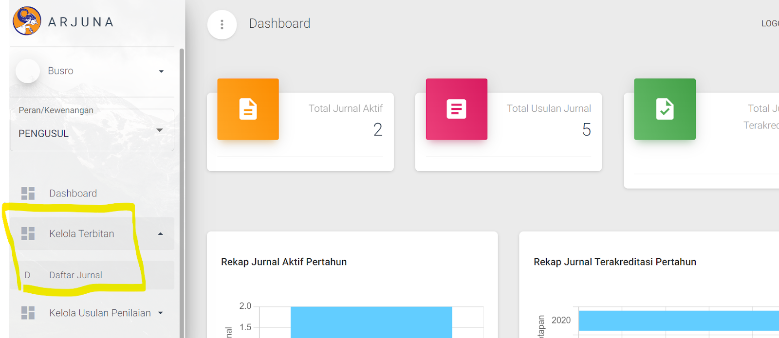 Setelah berhasil login, Anda akan diarahkan ke halaman utama ARJUNA. Di sana, carilah opsi atau menu “Kelola Terbitan”. Biasanya, opsi ini dapat ditemukan di bagian sidebar.