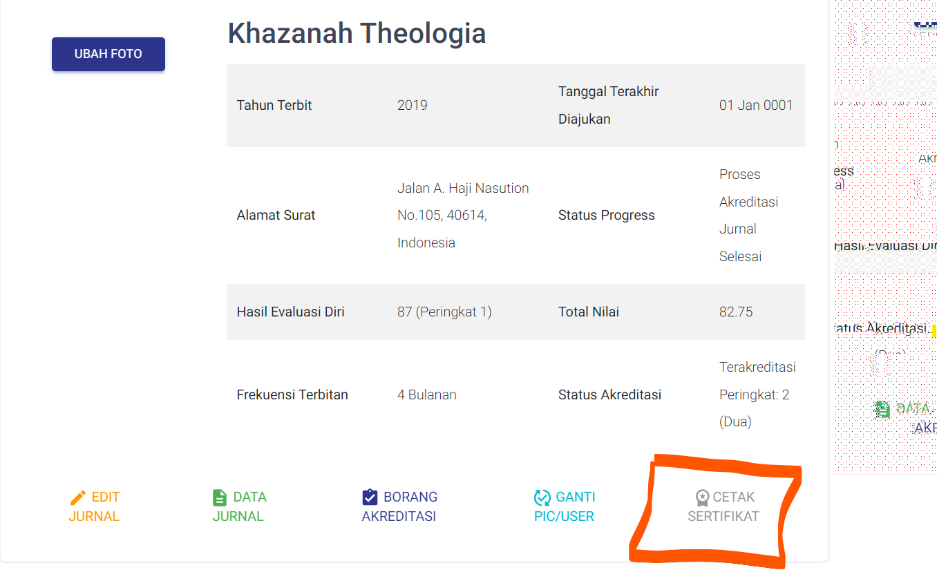 Di halaman detail jurnal, carilah opsi atau tombol yang menyediakan pilihan untuk mencetak sertifikat akreditasi. Tombol ini terletak di bagian bawah halaman sebelah kanan dengan label “Cetak Sertifikat”.