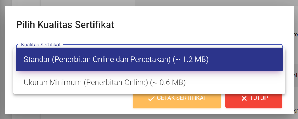 Setelah menekan tombol cetak sertifikat, Anda akan diberikan opsi untuk memilih kualitas sertifikat yang ingin Anda unduh. Pilihlah kualitas yang sesuai dengan kebutuhan Anda.