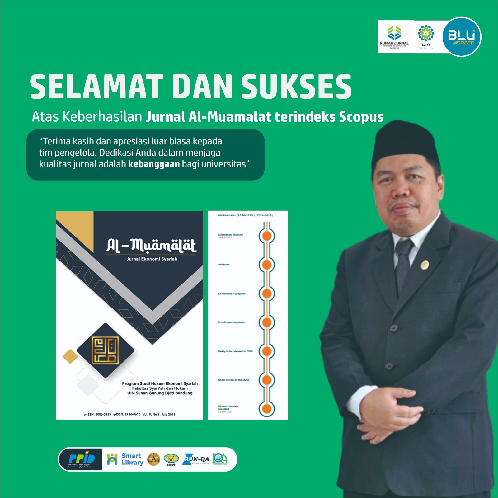 “Terindeksnya Jurnal Al-Muamalat ini sekaligus menegaskan capaian jurnal ke-6 UIN Sunan Gunung Djati Bandung yang berhasil terindeks Scopus. Capaian ini sejalan dengan kebijakan penguatan tridharma perguruan tinggi. Kami berharap prestasi ini dapat menjadi inspirasi dan motivasi bagi jurnal-jurnal lain di lingkungan UIN Sunan Gunung Djati Bandung untuk terus meningkatkan kualitas tata kelola, profesionalisme pengelolaan, serta substansi ilmiahnya. Saat ini, kami juga masih menunggu proses dan hasil evaluasi Scopus terhadap beberapa jurnal lain yang telah disubmitkan, sebagai bagian dari upaya berkelanjutan dalam memperkuat reputasi akademik universitas,” ungkap Wakil Rektor I.