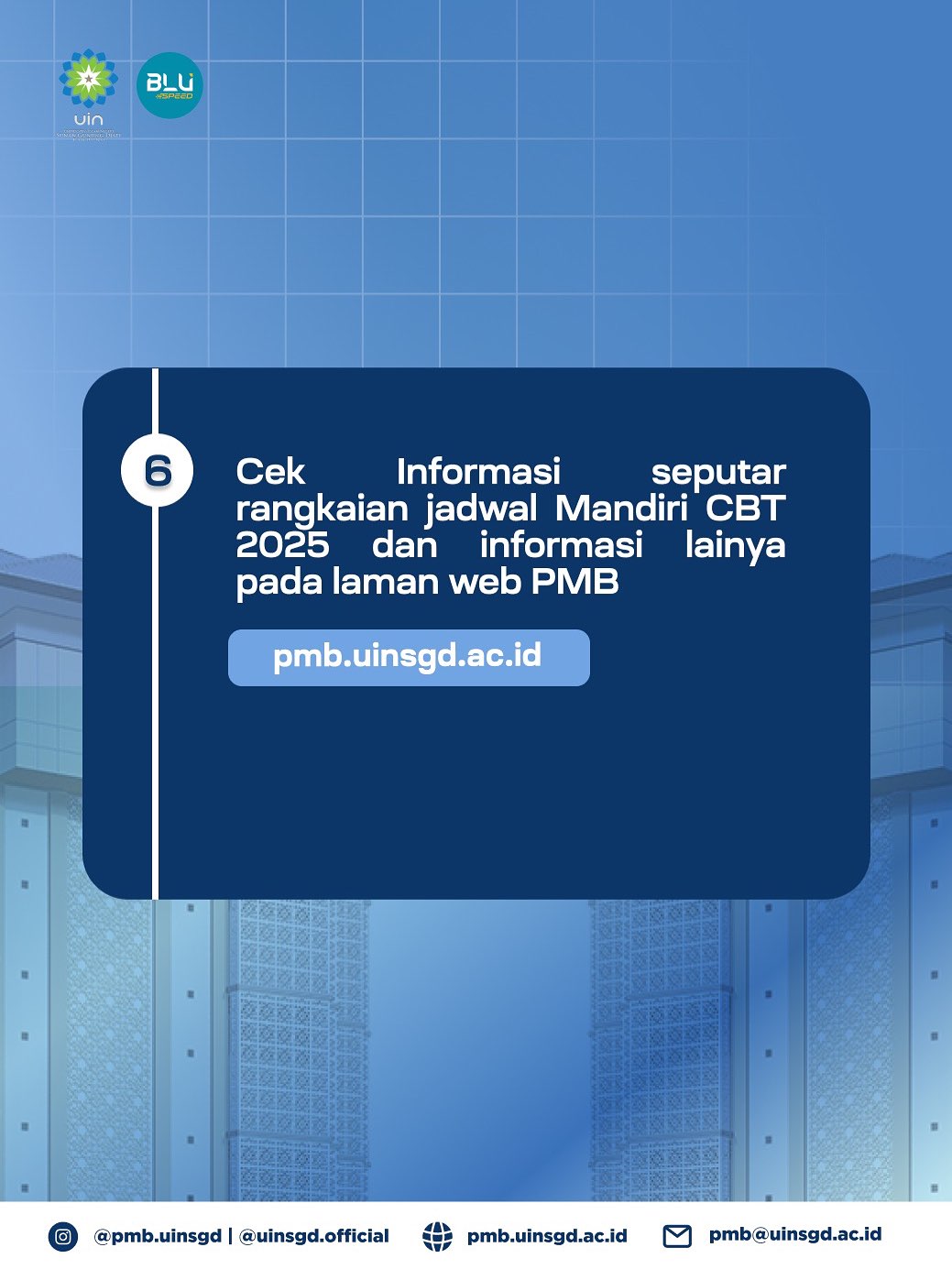 Seluruh informasi tambahan terkait rangkaian jadwal Mandiri CBT 2025 dapat diakses melalui laman pmb.uinsgd.ac.id.