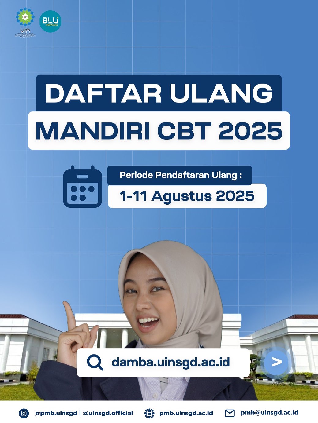 UINSGD.AC.ID (Humas) — UIN Sunan Gunung Djati Bandung resmi membuka pendaftaran ulang bagi peserta yang telah dinyatakan lulus Ujian Mandiri CBT 2025. Proses daftar ulang ini berlangsung mulai tanggal 1 hingga 11 Agustus 2025 dan dilakukan secara daring melalui laman https://damba.uinsgd.ac.id.