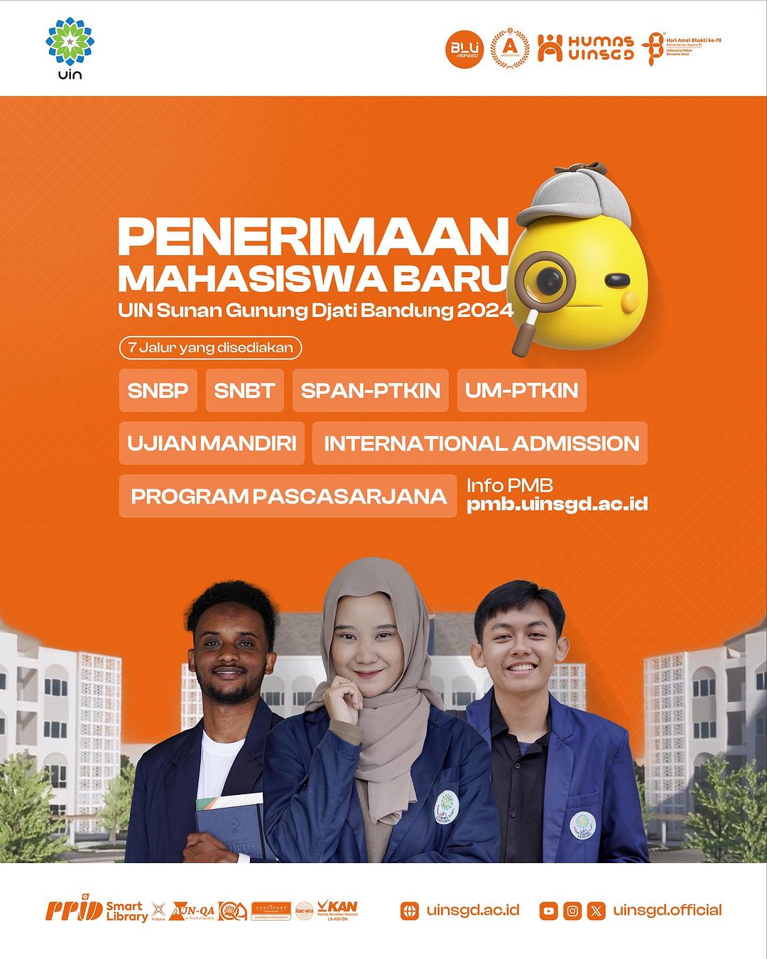 Informasi tentang PMB UIN Sunan Gunung Djati Bandung juga dapat diakses melalui laman https://pmb.uinsgd.ac.id/ dan @pmb.uinsgd Ikuti terus informasi terupdate hanya di @uinsgd.official ya! 😉