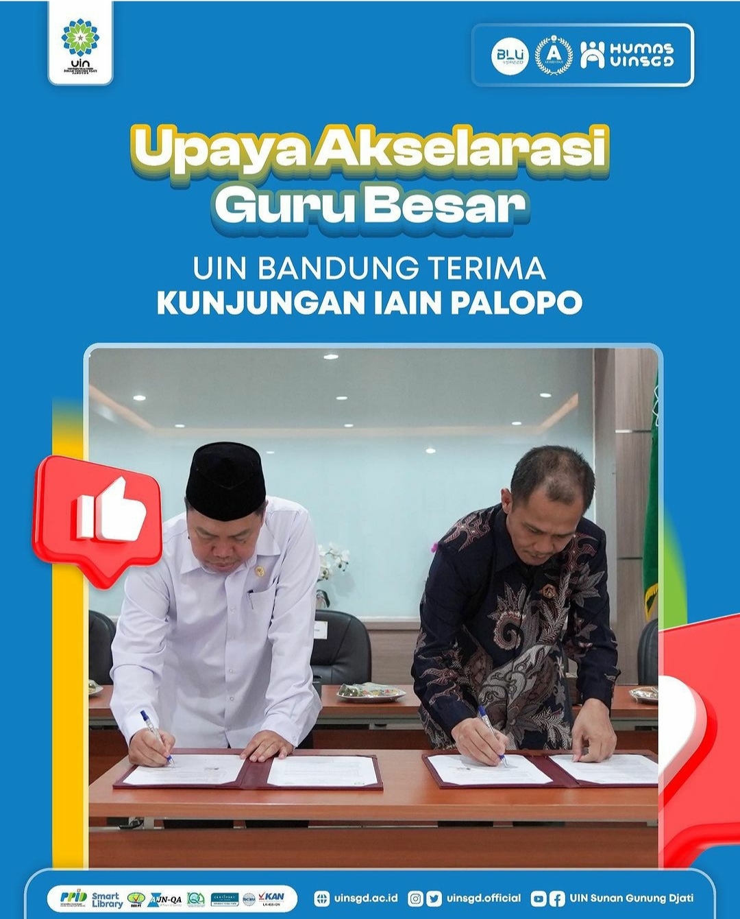 (UINSGD.AC.ID) —Rektor UIN Sunan Gunung Djati Bandung, Prof. Dr. H. Rosihon Anwar, M.Ag didampingi Wakil Rektor IV, Prof. Dr. H. Ah. Fathonih, M.Ag menerima kunjungan dari Institut Agama Islam Negeri (IAIN) Palopo, dalam rangka akselerasi Guru Besar, peningkatan akreditasi prodi, pengelolaan BLU dan halal center yang berlangsung di Gedung O. Djauharuddin AR, Selasa (21/11/2023).
