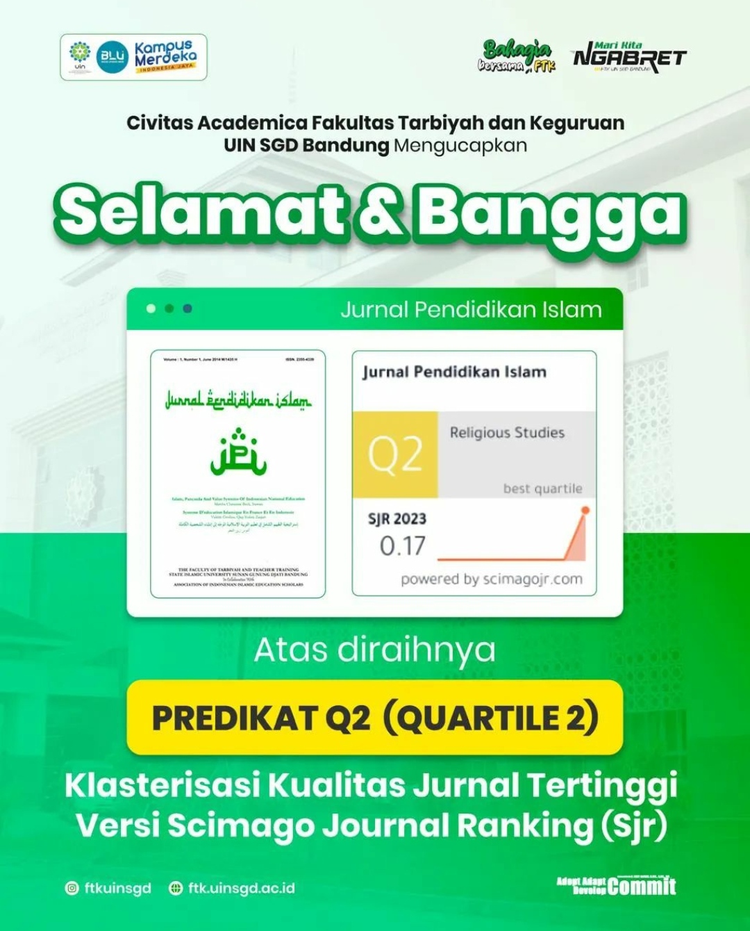 “Alhamdulillah. Sebuah pencapaian yang membanggakan untuk Jurnal Pemdidikan Islam FTK UIN Bandung. Selamat untuk pimpinan fakultas. Selamat pula untuk pengelola jurnal. Terima kasih Gus Men, Pak Sekjen, Pak Dirjen, dan Pak Direktur yang terus memberi motivasi kepada kami,” jelasnya.