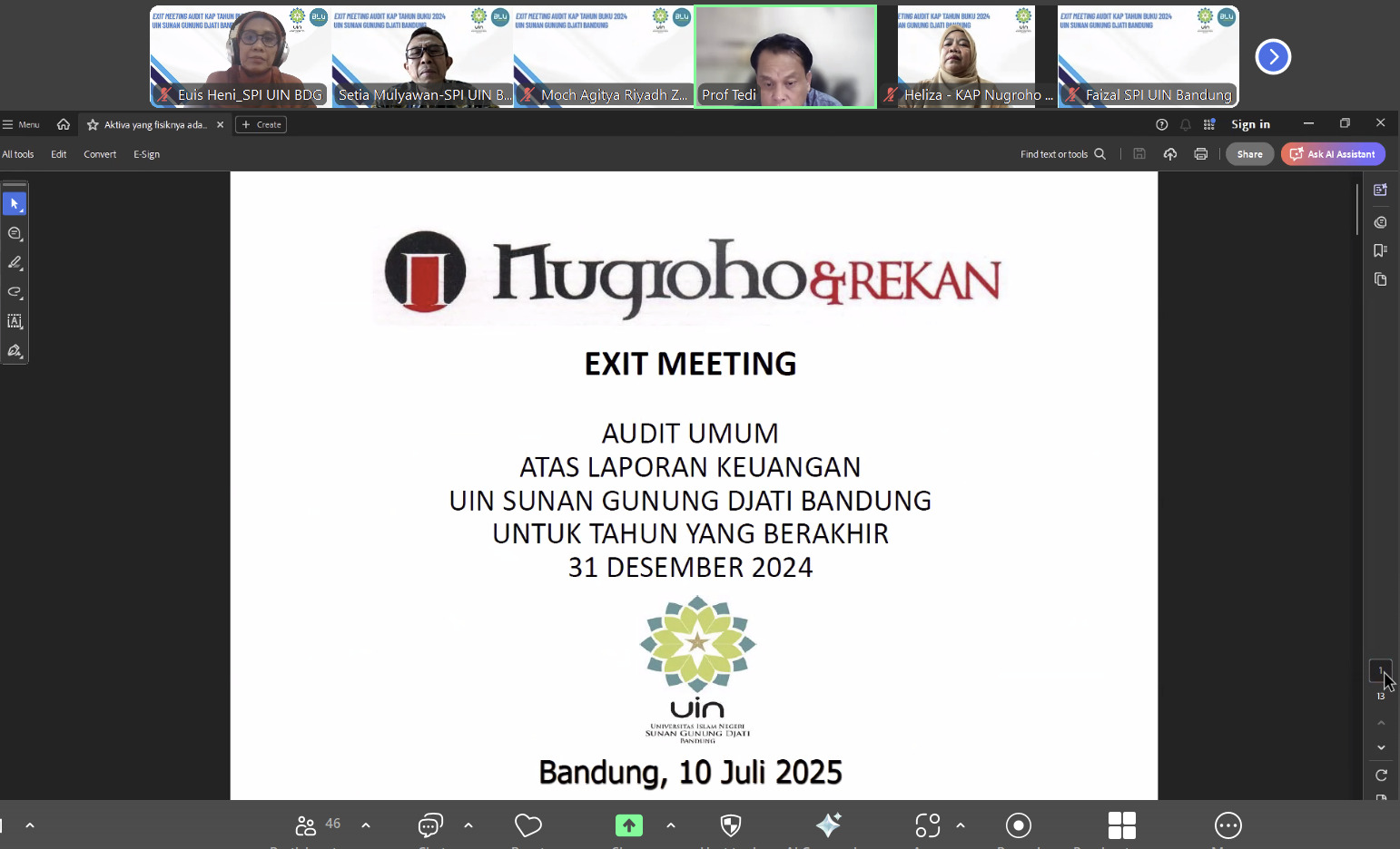Capaian ini diumumkan dalam Exit Meeting KAP yang berlangsung secara daring melalui Zoom Meeting, Kamis (10/7/2024). Exit meeting menjadi penanda berakhirnya pemeriksaan lapangan yang dilakukan auditor terhadap laporan keuangan.