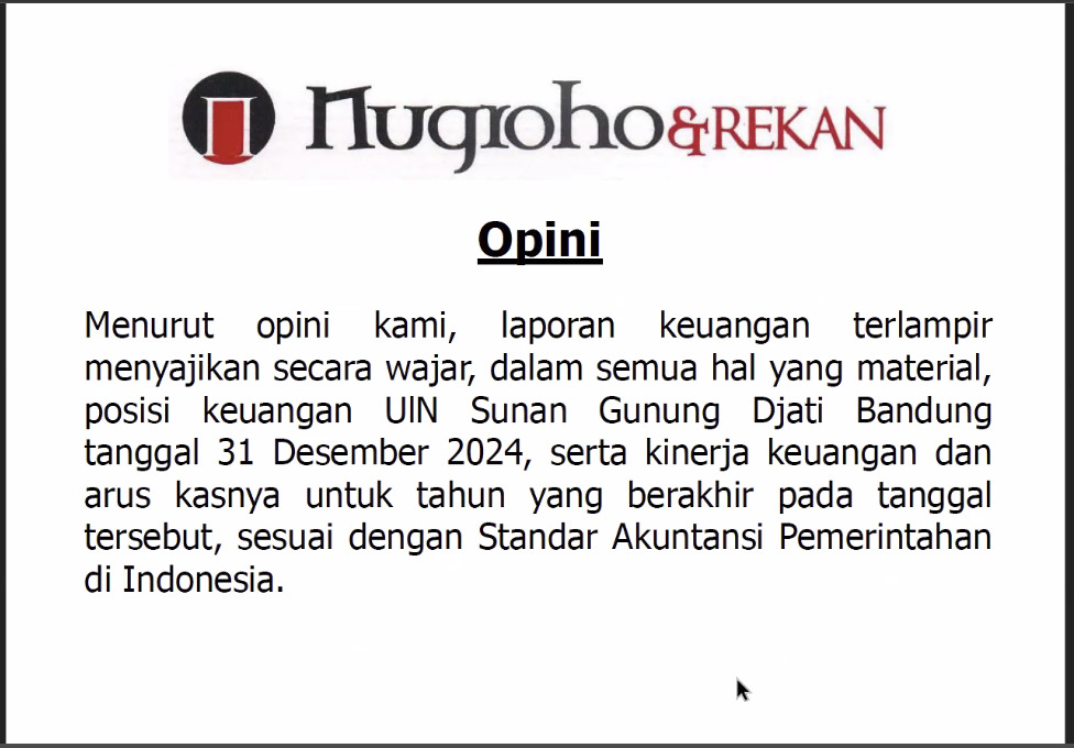 “Menurut opini kami, laporan keuangan UIN Sunan Gunung Djati Bandung menyajikan secara wajar, dalam semua hal yang material, posisi keuangan per 31 Desember 2024 serta kinerja keuangan dan arus kas untuk tahun yang berakhir pada tanggal tersebut, sesuai dengan Standar Akuntansi Pemerintahan,” tuturnya.