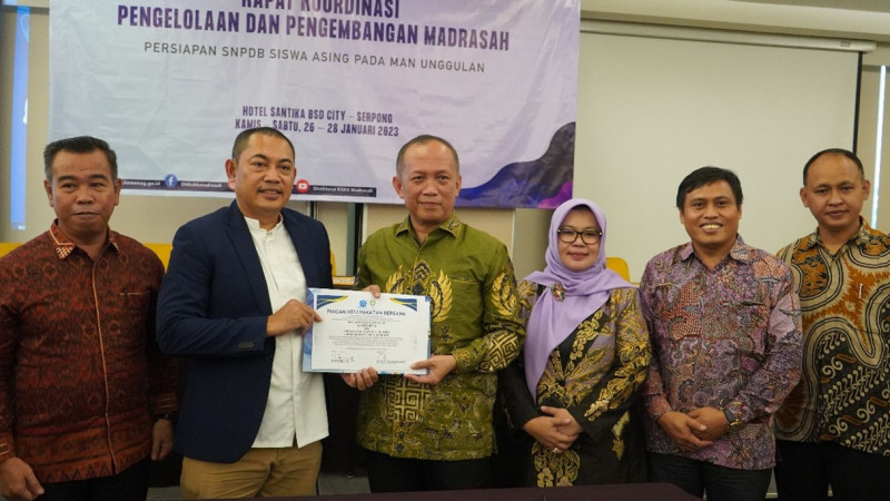 (UINSGD.AC.ID)-Ketua Kelompok Kerja Madrasah Aliyah Negeri (MAN) Insan Cendekia, Dr. Abdul Basith, M.Pd. dan Rektor Universitas Islam Negeri (UIN) Sunan Gunung Djati, Prof. Dr. Mahmud, M.Si., menandatangani Memorandum of Understanding (MoU) tentang Pengembangan Pendidikan di MAN Insan Cendekia. Penandatangan MoU tersebut dilakukan di sela-sela Rapat Koordinasi Pengelolaan dan Pengembangan Madrasah di Hotel Shantika, BSD, Jum’at, (27/1/2023).