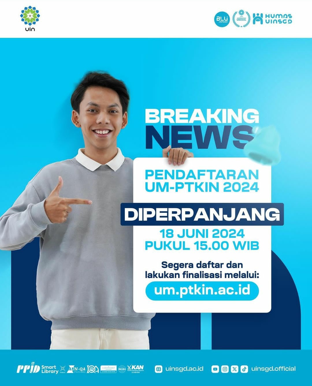Pendaftaran UM-PTKIN awalnya dibuka sejak 17 April -15 Juni 2024, kini diperpanjang hingga hari Selasa 18 Juni 2024 sampai batas waktu pukul 15.00 WIB.