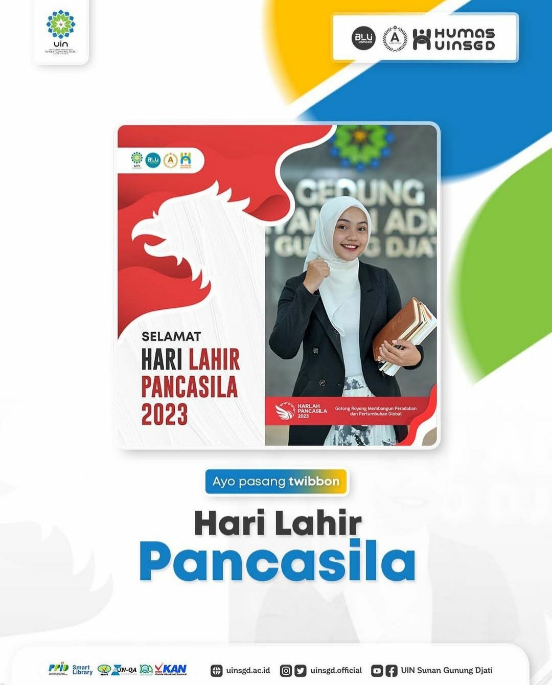 Ayo kita semarakkan Hari Lahir Pancasila dengan memasang twibbon di media sosial sebagai tanda partisipasi dan penghormatan terhadap ideologi negara kita.