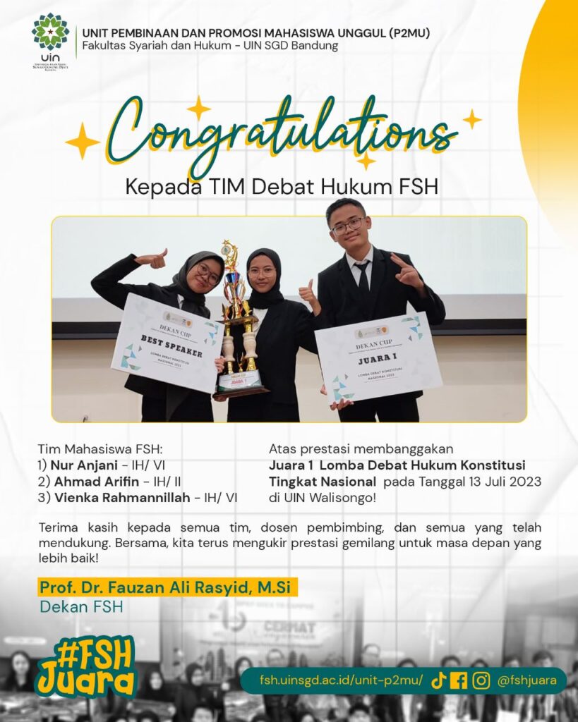 Dekan FSH, Prof Fauzan Ali Rasyid MSi menjelaskan capai membanggakan UIN Sunan Gunung Djati Bandung tercinta ini, “Luar biasa! Alhamdulillah pada tanggal 13 Juli tim debat hukum FSH meraih juara I dan best speaker dalam rangka Dekan Cup Lomba Debat Hukum Konstitusi Tingkat Nasional di UIN Walisongo Semarang. Hari ini bentuk syukur dari pimpinan dilakukan penyerahan trofi, hadiah, berupa sertifikat, uang pembinaan,” tegasnya, Jumat (21/7/2023).