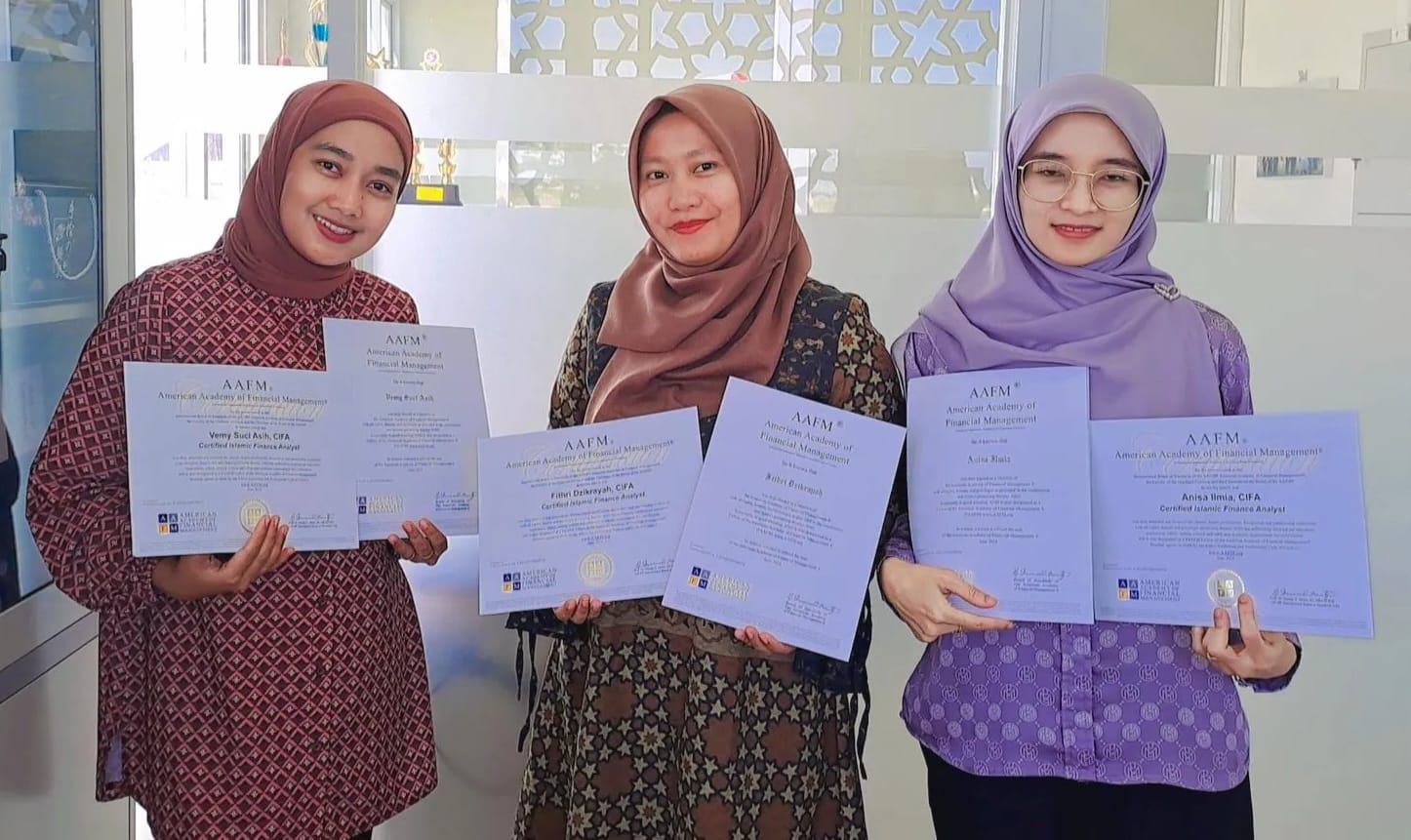 UINSGD.AC.ID (Humas) — Upaya membangun inovasi, kolaborasi dan peningkatan kapasitas, tiga dosen Fakultas Ekonomi dan Bisnis Islam (FEBI) UIN Sunan Gunung Djati Bandung, Anisa Ilmia, ME., CIFA., Fithri Dzikrayah, ME., CIFA, dan Vemy Suci Asih, ST., ME.Sy., CIFA dikirim untuk menjadi Member American Academy of Financial Management (AAFM), dan berhasil tersertifkasi pada bidang keuangan Islam dengan gelar Certified Islamic Finance Analyst (CIFA).
