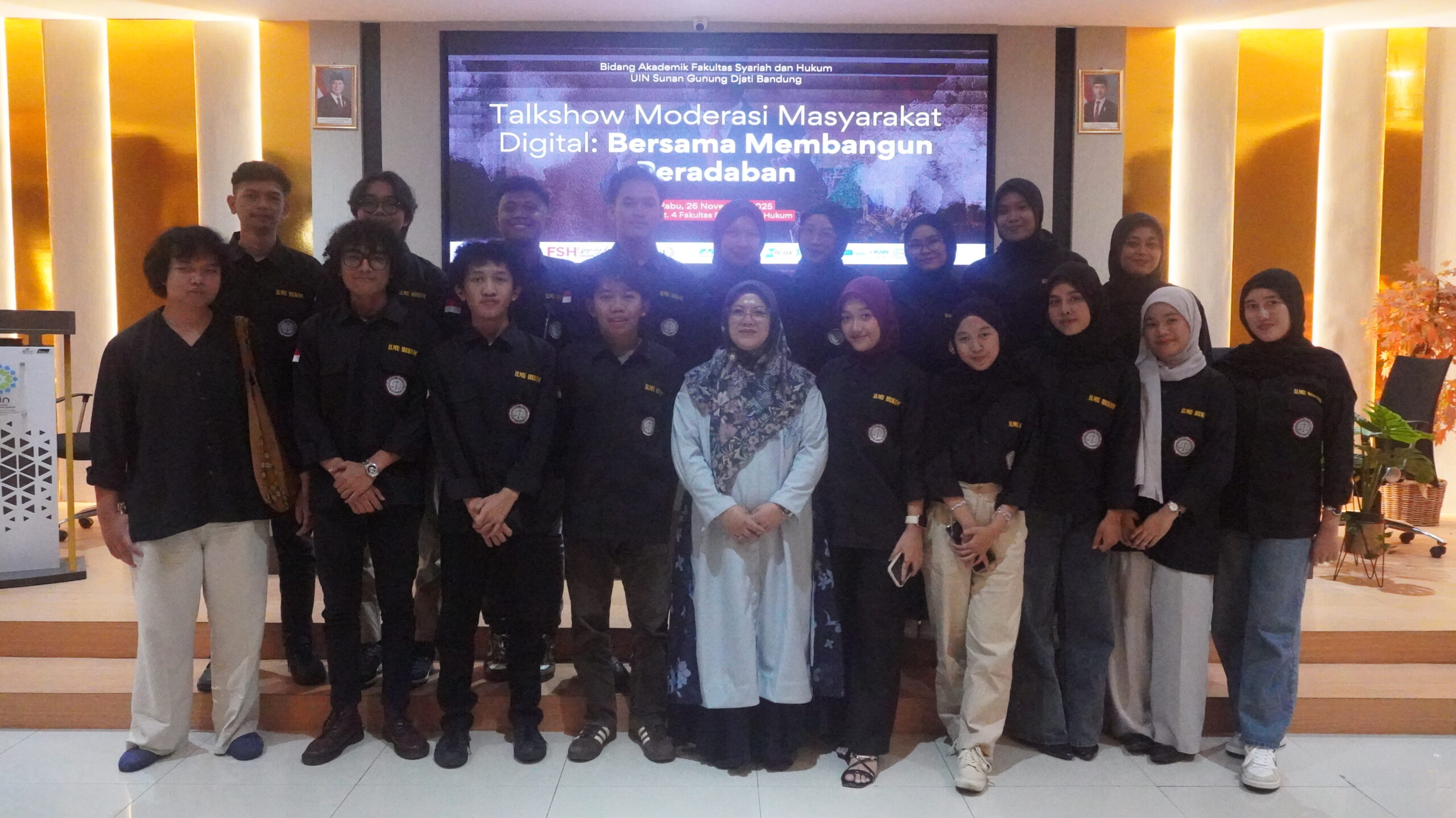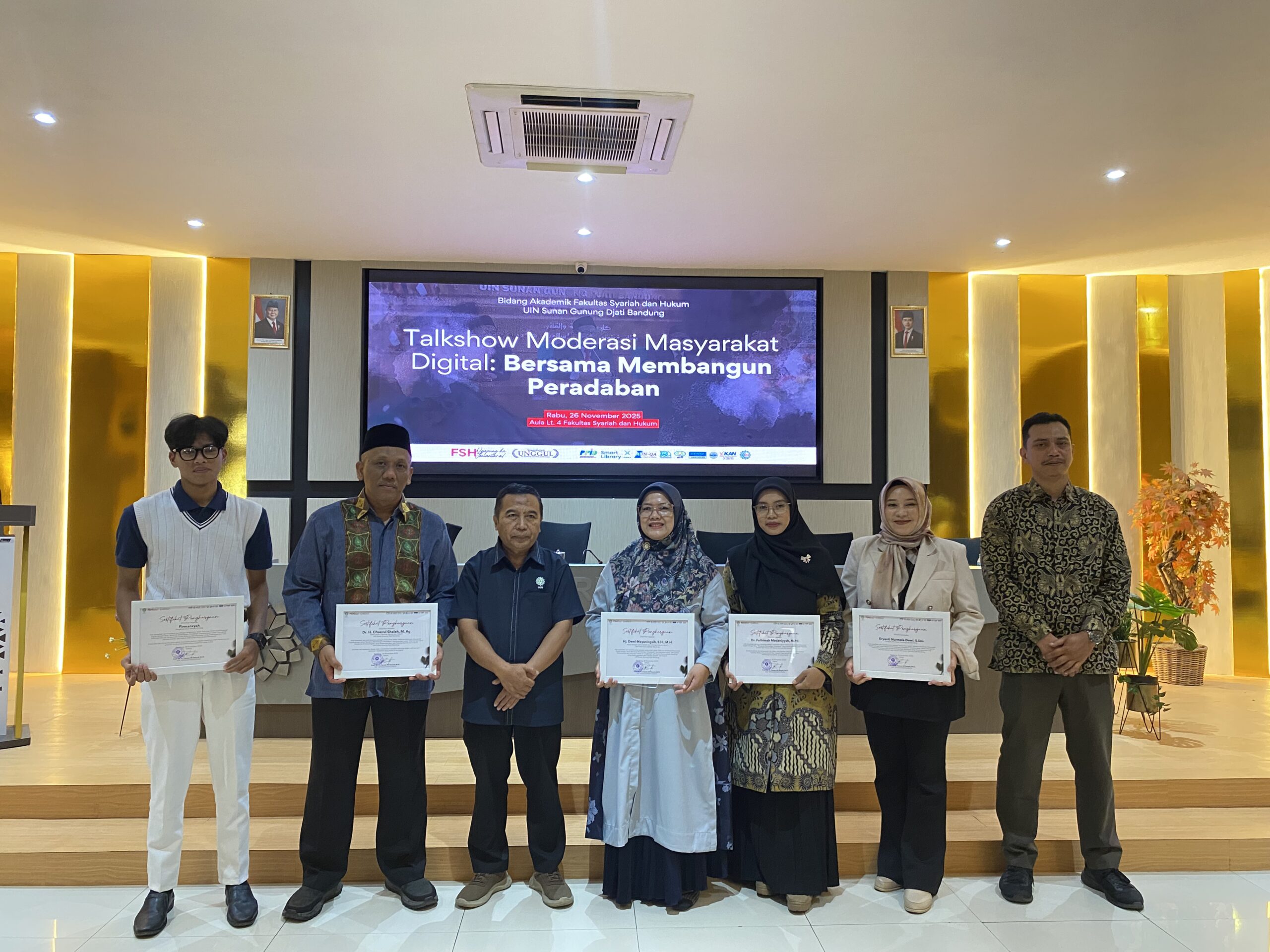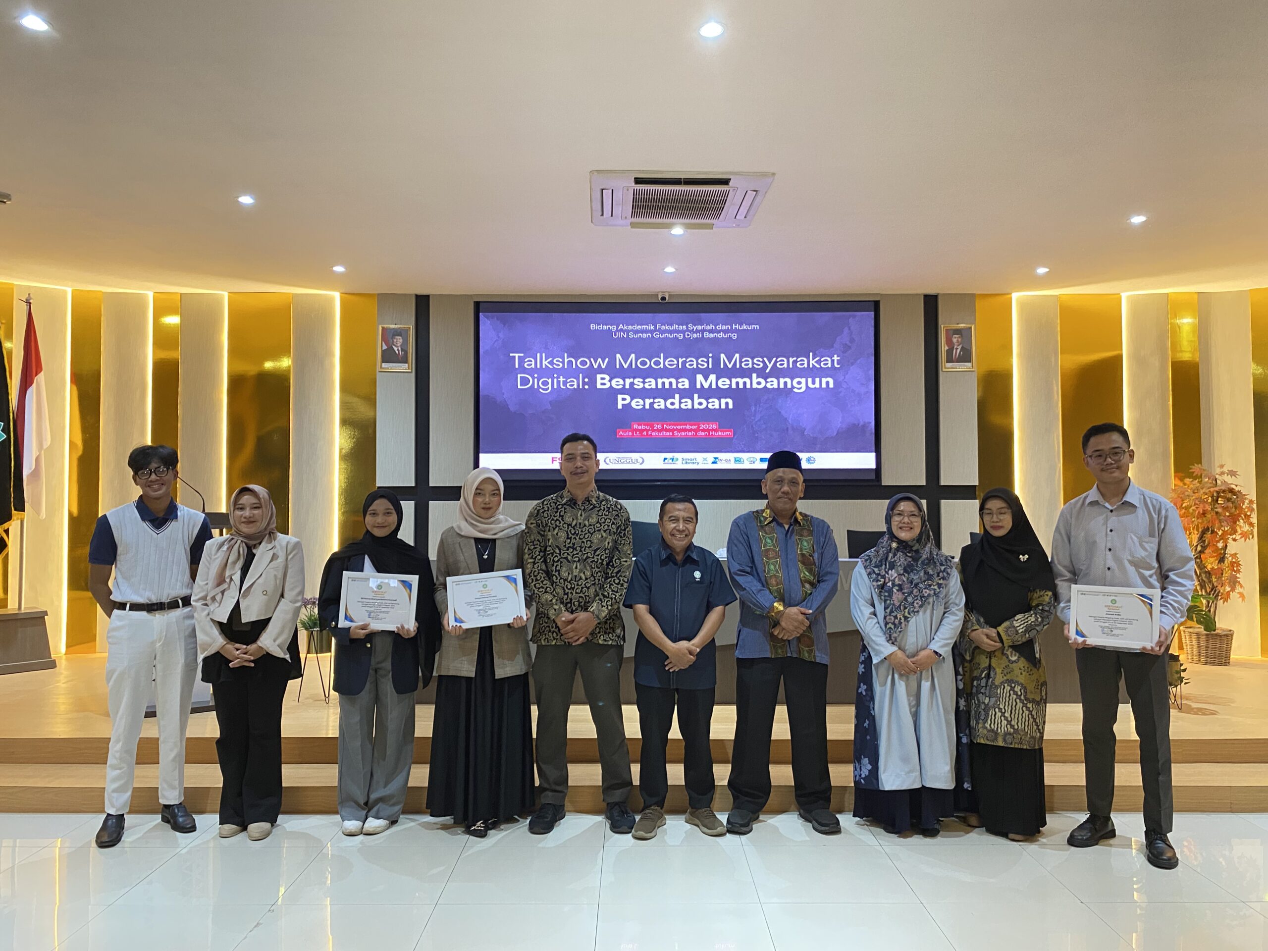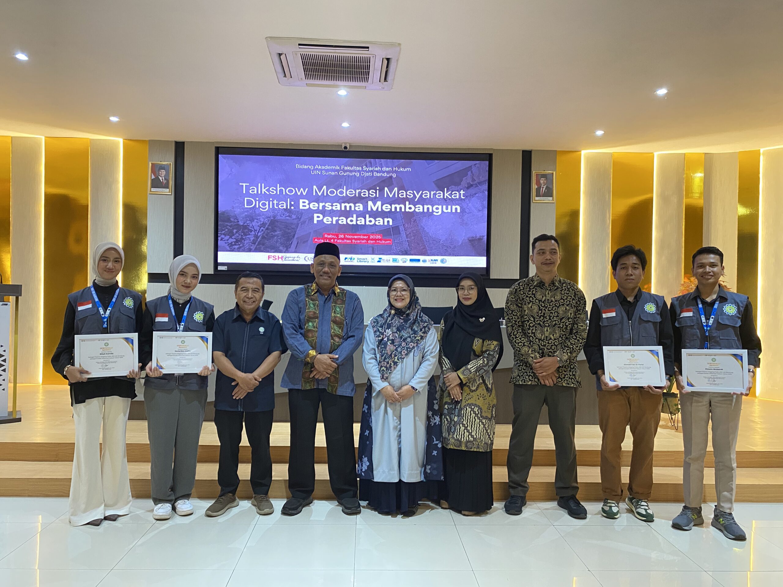 UINSGD.AC.ID (Humas) — Dengan semangat membangun ruang digital yang sehat dan inklusif, Fakultas Syariah dan Hukum (FSH) UIN Sunan Gunung Djati Bandung menggelar Talkshow Moderasi Masyarakat Digital bertajuk “Bersama Membangun Peradaban”, yang berlangsung di Aula FSH Lantai 4, Rabu (26/11/2025)