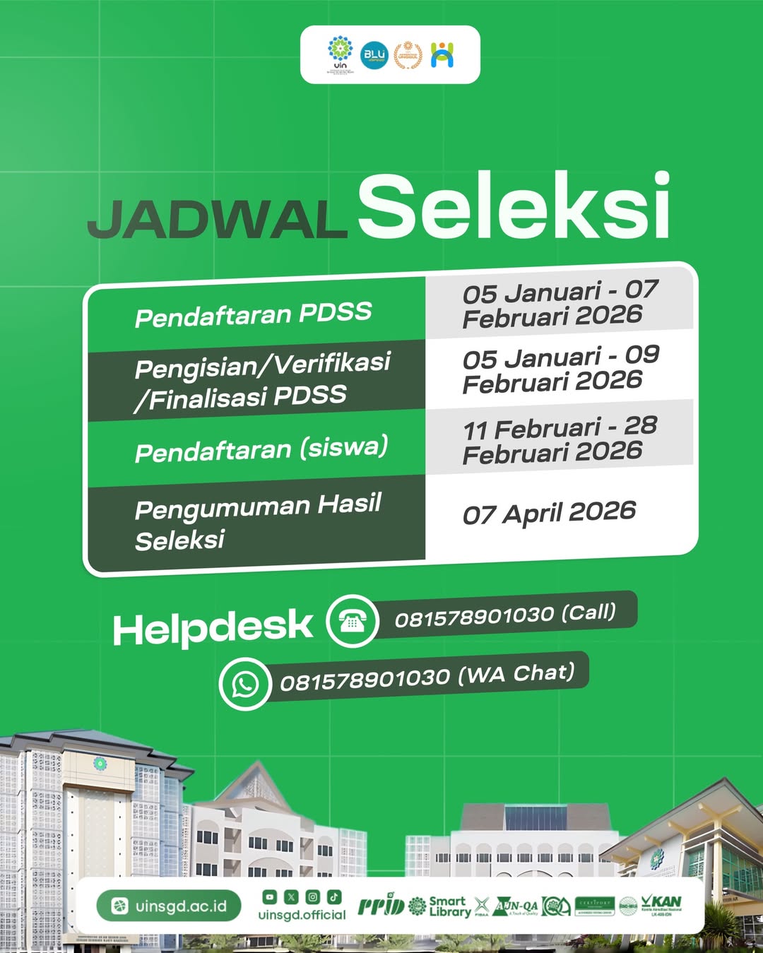 UINSGD.AC.ID (Humas) — Pengisian Pangkalan Data Sekolah dan Siswa (PDSS) untuk Penerimaan Mahasiswa Baru Perguruan Tinggi Keagamaan Islam Negeri (PMB PTKIN) dibuka mulai hari ini hingga 7 Februari 2026. Tahapan ini merupakan langkah awal yang harus diikuti satuan pendidikan agar dapat mendaftarkan siswa-siswi terbaiknya mengikuti Seleksi Prestasi Akademik Nasional (SPAN-PTKIN) 2026.
