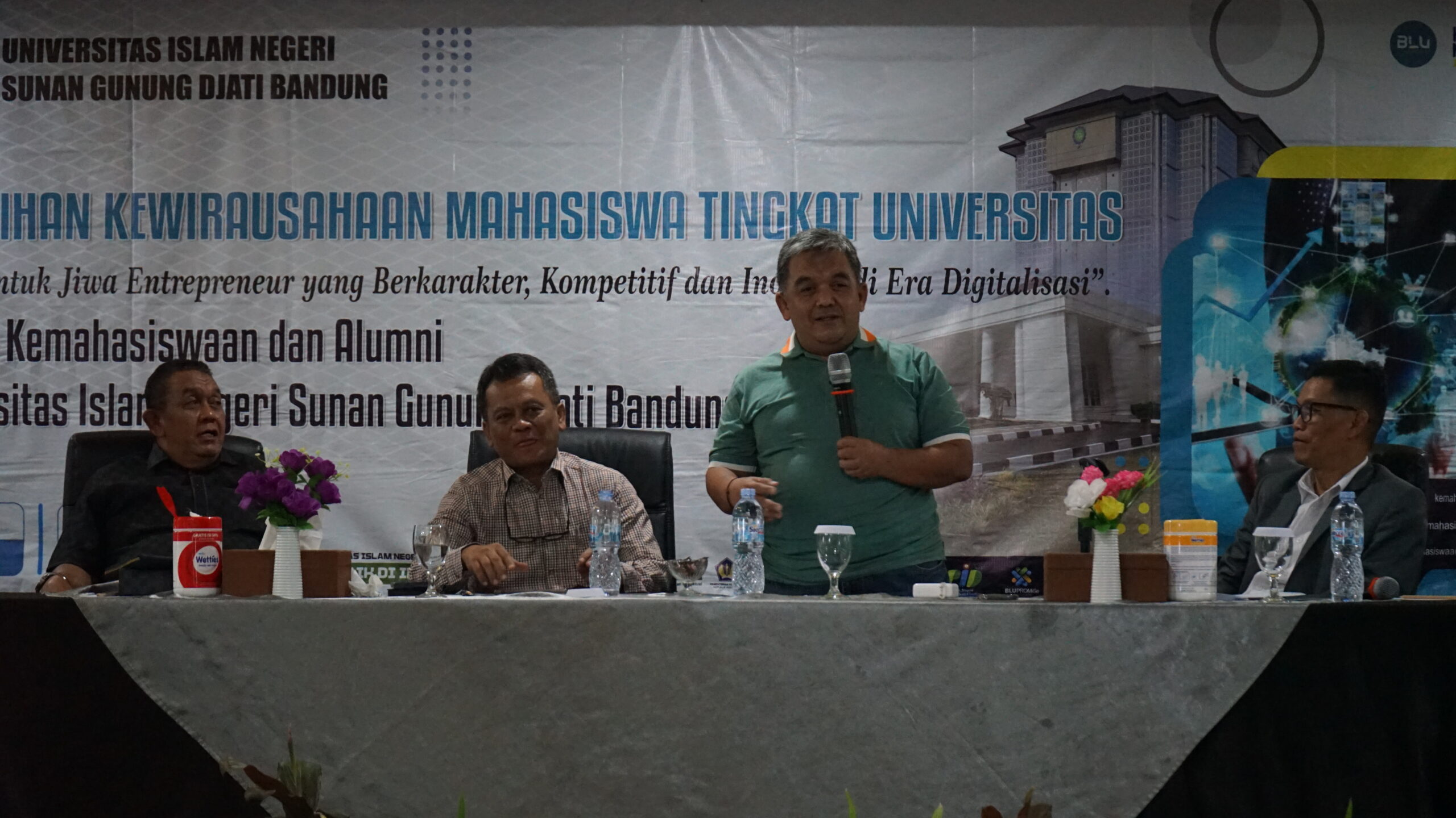 Drs. Cucu Sutara, MM (Wakil Ketua Kadin Indonesia sekaligus Ketua IKA UIN Bandung), Nandang Komara, (Praktisi, Pemilik N2N Busana Muslim), Irman (Praktisi, Pengusaha Nasi Liwet Instant 1001 Garut), Pendi Yusup Muhtar Effendi (Penggiat UMKM Indonesia), tampil menjadi narasumber pelatihan yang dipandu oleh Dr R. Yuli Ahmad Hambali, M.Hum., Drs. Idad Suhada, M.Pd.