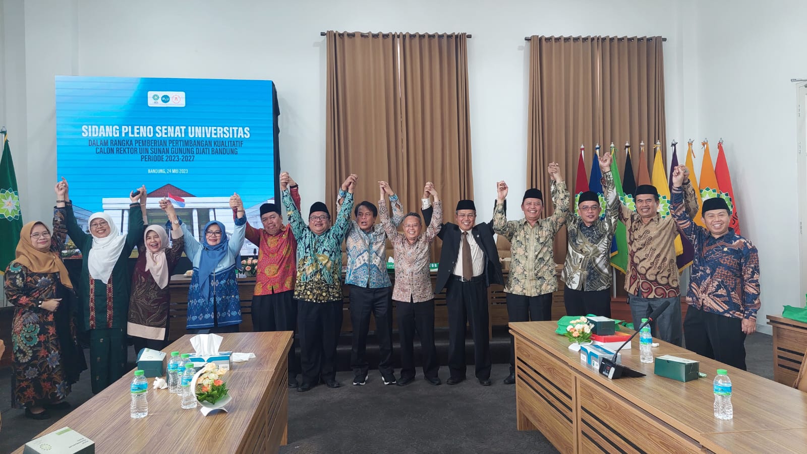 Deklarasi damai terjadi pada Sidang Pleno Senat Universitas dalam rangka Pemberian Pertimbangan Kualitatif Calon Rektor UIN Sunan Gunung Djati Bandung Periode 2023-2027 yang dipimpin oleh Ketua Senat Universitas, Prof. Dr. H. Nanat Fatah Natsir, M.S didampingi Sekretaris Senat Universitas, Prof. Dr. H. Idzam Fautanu, M.Ag., Ketua Panitia, Dr. Setia Gumilar, M.Si. yang berlangsung di Gedung Rektorat Kampus II, Rabu (24/5/2023).