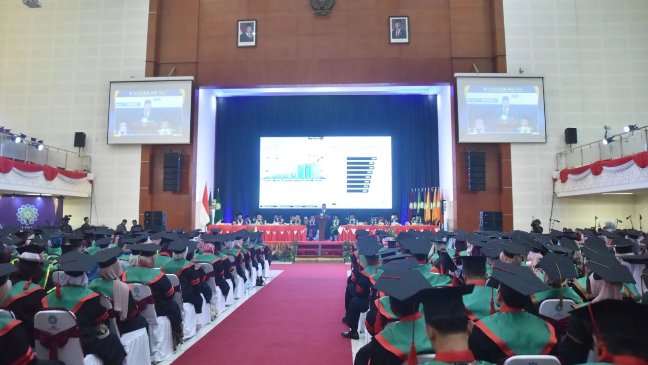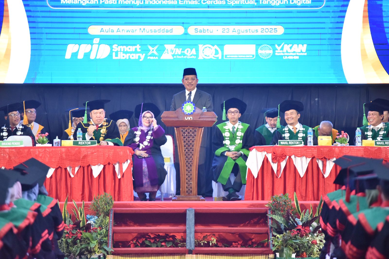 UINSGD.AC.ID (Humas) — UIN Sunan Gunung Djati Bandung menggelar Sidang Senat Terbuka Wisuda ke-104 bertajuk Melangkah Pasti menuju Indonesia Emas: Cerdas Spiritual, Tangguh Digital yang berlangsung di Gedung Anwar Musaddad, Sabtu (23/8/2025). Sebanyak 1.700 lulusan dari berbagai program studi resmi dikukuhkan dalam prosesi yang berlangsung khidmat.