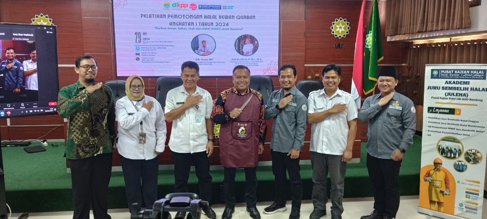 UINSGD.AC.ID (Humas) — Upaya meningkatkan kualitas pemotongan hewan qurban yang sesuai dengan syariat Islam, Dinas Pangan dan Pertanian (Dispangtan) Kota Bandung bekerjasama dengan Akademi Juleha-Halal Center Universitas Islam Negeri (UIN) Sunan Gunung Djati Bandung menyelenggarakan pelatihan pemotongan halal hewan qurban, Rabu (29/5/2024).