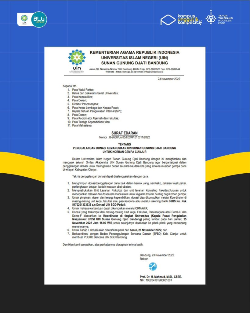 (UINSGD.AC.ID)-Rektor Universitas Islam Negeri Sunan Gunung Djati Bandung dengan ini menghimbau dan mengajak seluruh Sivitas Akademika UIN Sunan Gunung Djati Bandung agar berpartisipasi dalam penggalangan donasi untuk meringankan beban saudara-saudara kita yang terkena musibah gempa bumi di wilayah Kabupaten Cianjur.