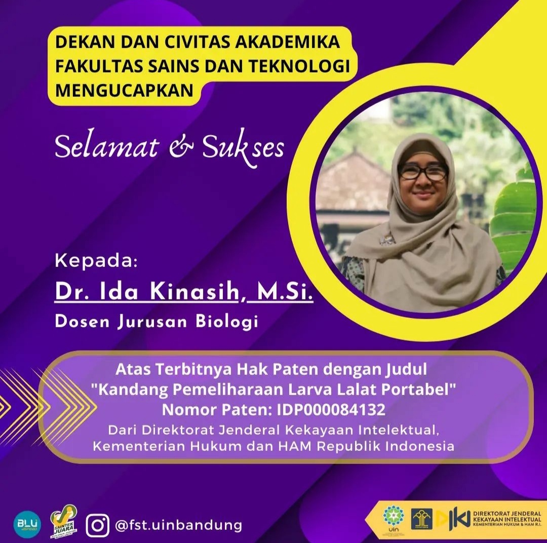 (UINSGD.AC.ID)-Dosen Jurusan Biologi Fakultas Sains dan Teknologi (FST) UIN Sunan Gunung Djati Bandung merasa bersyukur dan bangga atas terbitnya Hak Paten dari Direktorat Jenderal Kekayaan Intelektual Kementerian Hukum dan HAM RI, dengan Nomor paten IDP000084132.