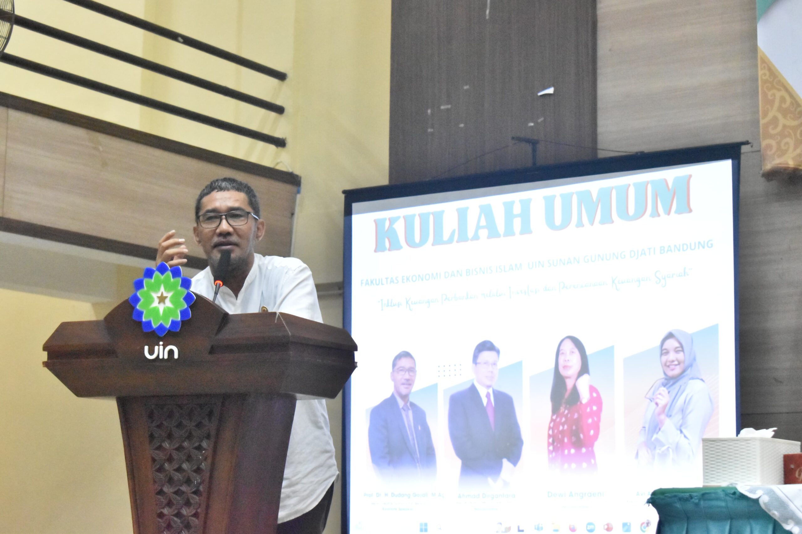 Wakil Dekan I FEBI UIN SGD Dr. Iwan Setiawan menyampaikan bahwa kuliah umum ini diikuti oleh 870 mahasiswa dari keempat jurusan yakni Akuntansi Syariah, Ekonomi Syariah, Manajemen, dan Manajemen Keuangan Syariah.