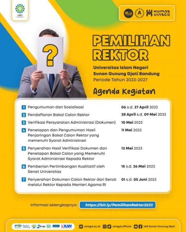 (UINSGD.AC.ID)- Pendaftaran Bakal Calon Pemilihan Rektor UIN Sunan Gunung Djati Bandung periode 2023-2027, sudah dibuka dari tanggal 28 April-9 Mei 2023.