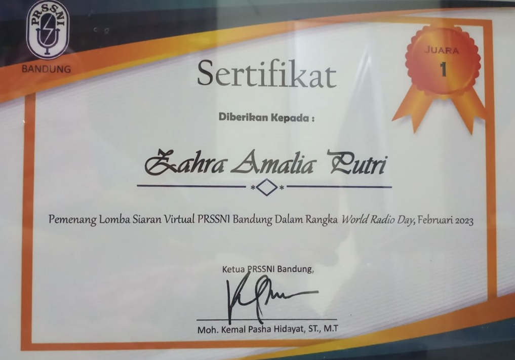 Lalu juara 10 karya ilmiah terbaik Lomba Karya Tulis Ilmiah Nasional tingkat mahasiswa 2023 yang ditulis secara berkelompok oleh mahasiswa semester 2 Resvy Sahidah Umaroh, Rizqi Afrelina, dan Vionalisania Afifatul Azkia. Selain itu juga Zahra Amalia Putri, Juara 1 Lomba Siaran Virtual, Radio Challenge Seru 2023 dengan Penyelenggara PRSSNI Bandung, dan Maulana Abdullah, Juara 1 Lomba MQK (Musabaqah Qira’atil Kutub) kitab Fathul Mu’in 2023 dalam gelaran Gradasi 2023 yang diselenggarakan HMJ Bahasa dan Sastra Arab, UIN SGD Bandung.