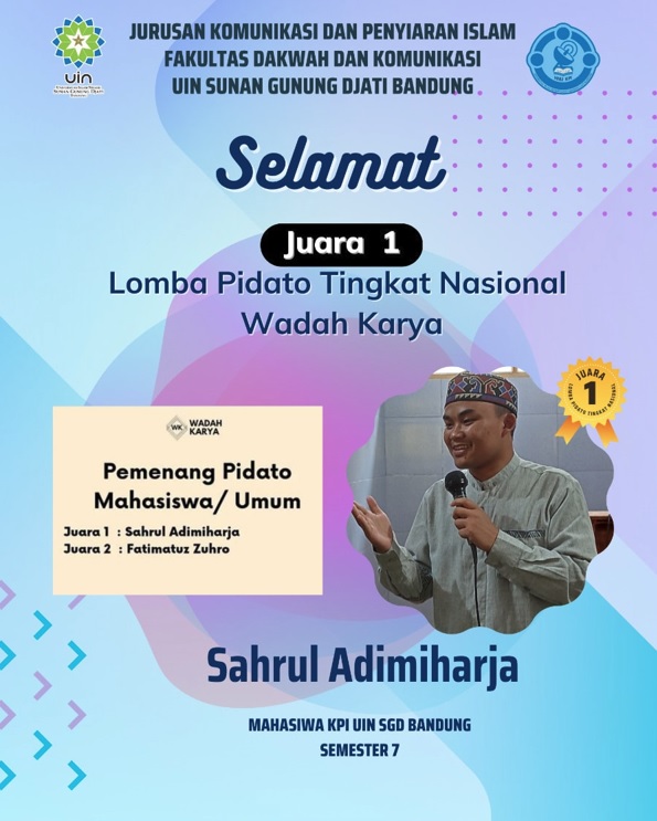 Prestasi pertama, yaitu prestasi sesuai ranah Kajian Prodi KPI. Menurut Uwes prestasi ini paling banyak diraih oleh Sahrul Adimiharja, mahasiswa semester 8 dengan 5 juara lomba public speaking atau ceramah tingkat nasional selama 2023, yaitu Juara 1 Pidato Tingkat Nasional 2023 yang diselenggarakan oleh Wadah Karya, Bogor Jawa Barat, Juara 2 Audisi Dai Daiyah Tingkat Nasional 2023oleh Pondok Pesantren Fathul Huda Demak Jawa Tengah, Juara 2 Lomba Dakwah dalam ajang Pekan Islami Nasional MEGAMIC 2023 oleh HMJ Manajemen Universitas Islam Sultan Agung Semarang Jawa Tengah, juara harapan 2 Lomba Pidato KENCANA_DRAWRT, Denpasar Bali dan Terbaik 8 Musabaqah Dai Muda (MDM) GESIDAR yang diselenggarakan oleh Komunitas MTD (Muhibbin Tilawah wa Dakwah) Malang Jawa Timur.