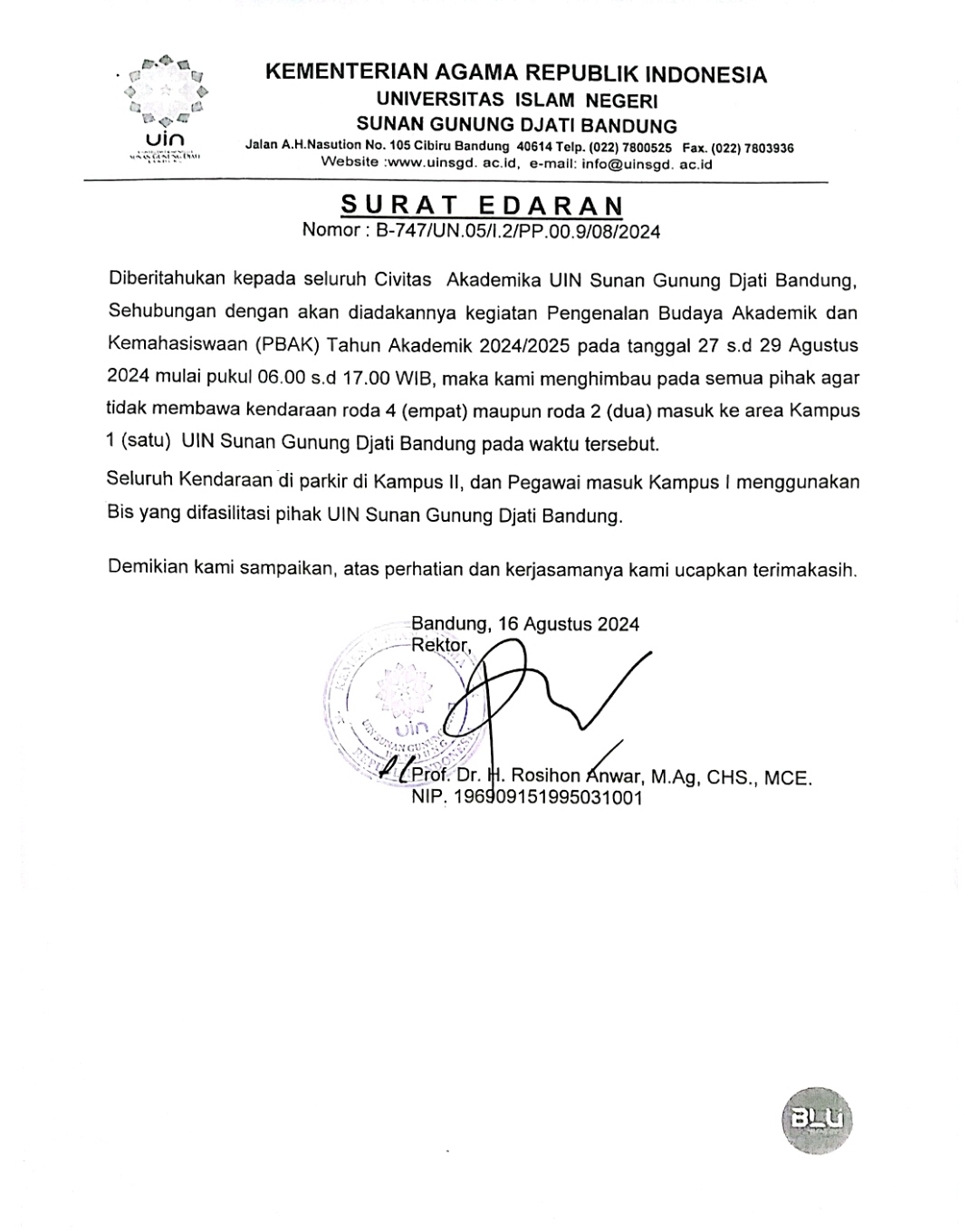 UINSGD.AC.ID (Humas) — Diberitahukan kepada seluruh Civitas Akademika UIN Sunan Gunung Djati Bandung, Sehubungan dengan akan diadakannya kegiatan Pengenalan Budaya Akademik dan Kemahasiswaan (PBAK) Tahun Akademik 2024/2025 pada tanggal 27 s.d 29 Agustus 2024 mulai pukul 06.00 s.d 17.00 WIB, maka kami menghimbau pada semua pihak agar tidak membawa kendaraan roda 4 (empat) maupun roda 2 (dua) masuk ke area Kampus 1 (satu) UIN Sunan Gunung Djati Bandung pada waktu tersebut.