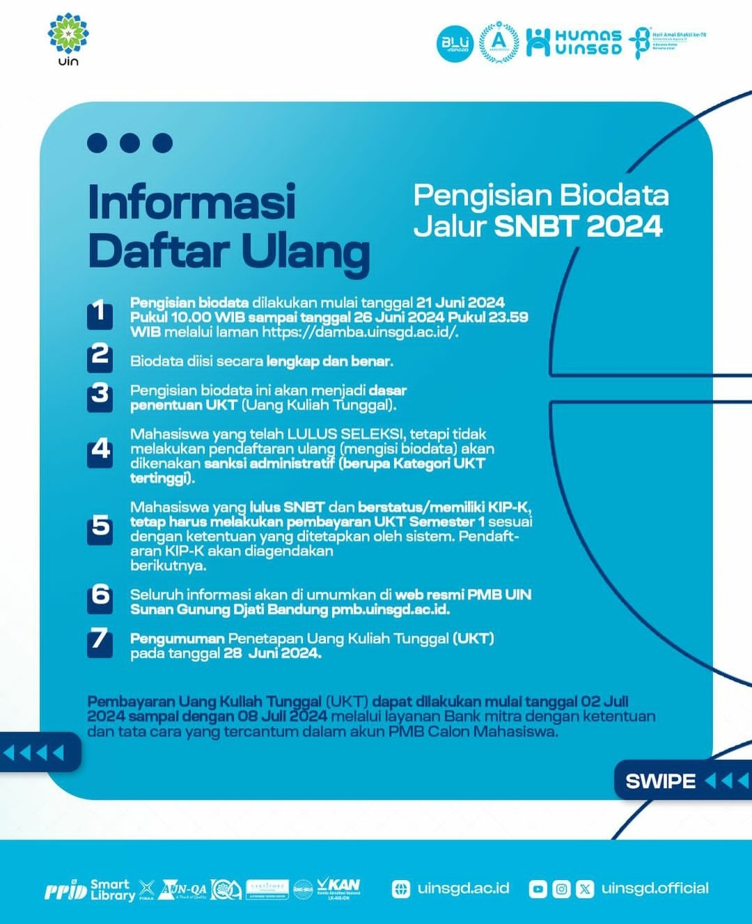 6. Seluruh informasi akan di umumkan di web resmi PMB UIN Sunan Gunung Djati Bandung pmb.uinsgd.ac.id.
