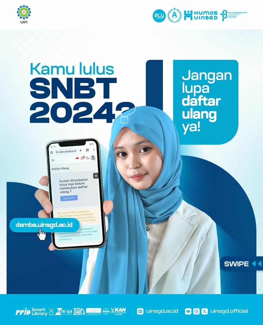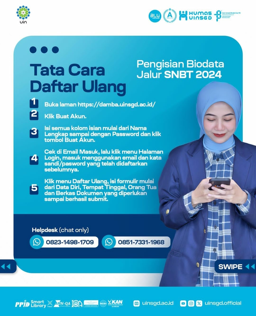 UINSGD.AC.ID (Humas) — Pengisian biodata untuk teman-teman yang LULUS pada Jalur Seleksi Nasional Berdasarkan Tes (SNBT) Ujian Tulis Berbasis Komputer (UTBK) 2024 yang mendaftar di UIN Sunan Gunung Djati Bandung.