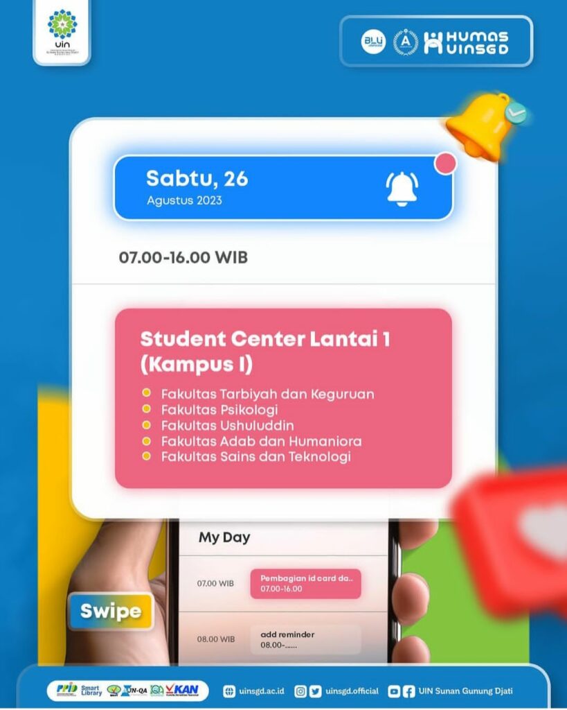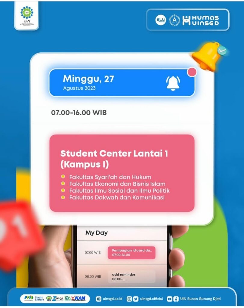 Pengambilan ID Card dan Buku Pedoman PBAK dijadwalkan tanggal 26-27 Agustus 2023 mulai pukul 07.00 – 16.00 WIB (silakan datang pada rentang waktu tersebut) di Aula Gedung Student Center Lantai 1, Kampus I (satu) UIN Sunan Gunung Djati Bandung.