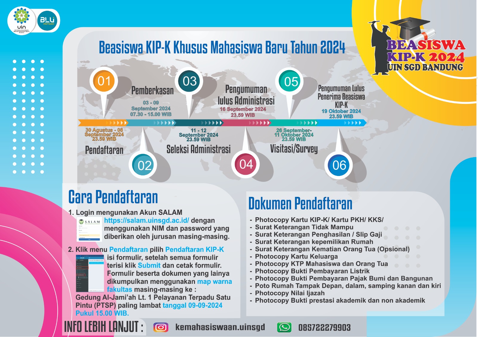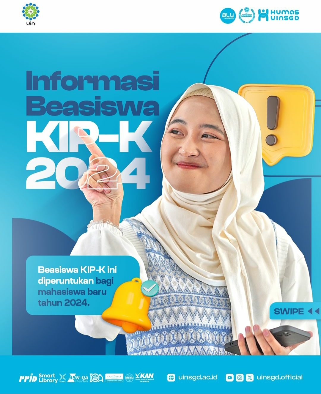 UINSGD.AC.ID (Humas) — Beasiswa Kartu Indonesia Pintar Kuliah (KIP-K) merupakan salah satu program bantuan pendidikan, khusus bagi mahasiswa baru di lingkungan UIN Sunan Gunung Djati tahun 2024. Pendaftaran KIP-K akan dibuka mulai tanggal 30 Agustus – 8 September 2024 pukul 23. 59 WIB melalui laman https://salam.uinsgd.ac.id/