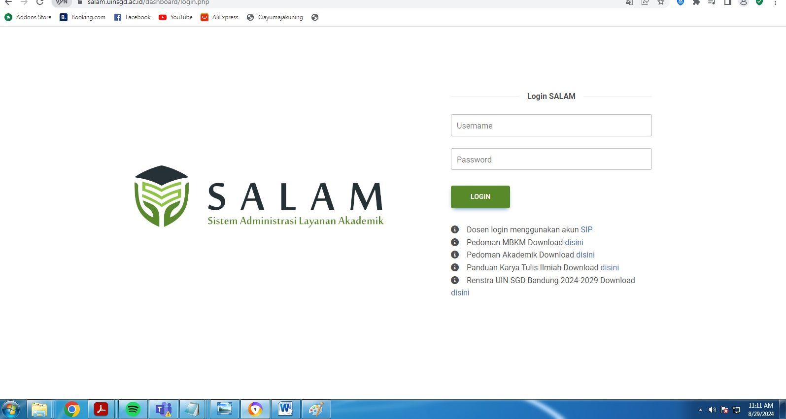 1. Login menggunakan Akun SALAM dengan menggunakan NIM dan password yang diberikan oleh jurusan masing-masing.