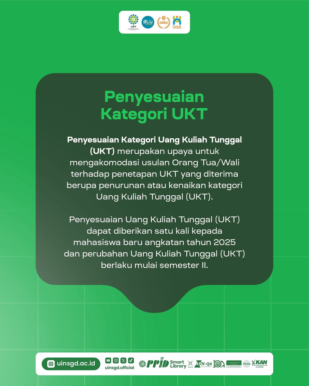 UINSGD.AC.ID (Humas) — Untuk mengetahui Informasi penyesuaian kategori Uang Kuliah Tunggal (UKT) bagi mahasiswa baru Program Sarjana UIN Sunan Gunung Djati Bandung tahun akademik 2025/2026.