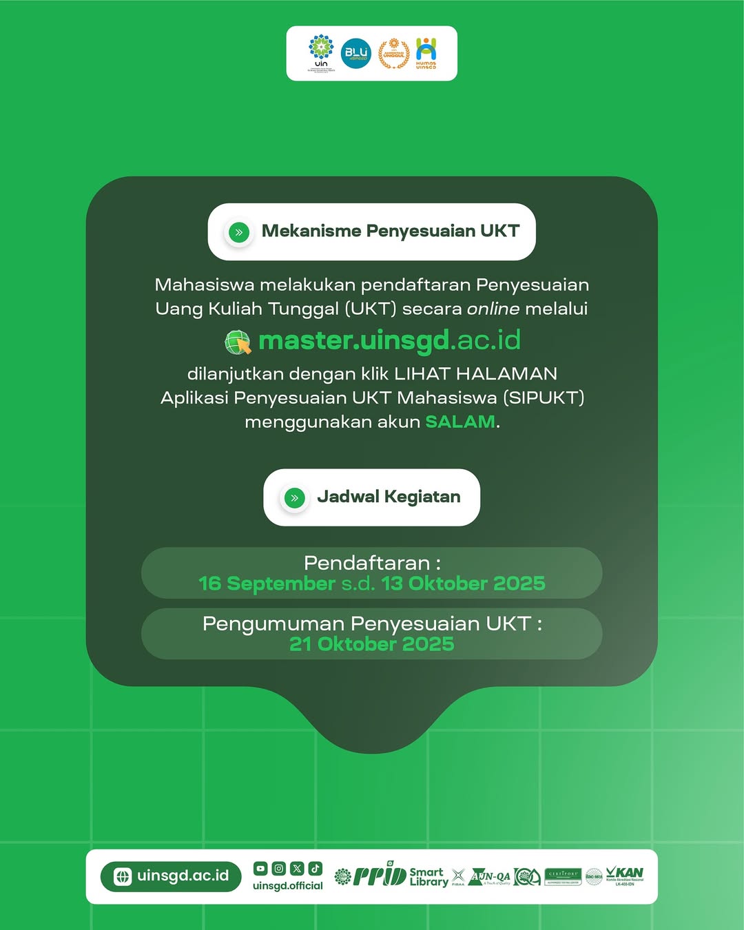 Mohon disimak baik-baik ya! mulai dari mekanisme, pendaftaran online melalui laman https://master.uinsgd.ac.id dari tanggal 16 September – 13 Oktober 2025 dan hasil pengumuman penyesuaian UKT pada tanggal 21 Oktober 2025.