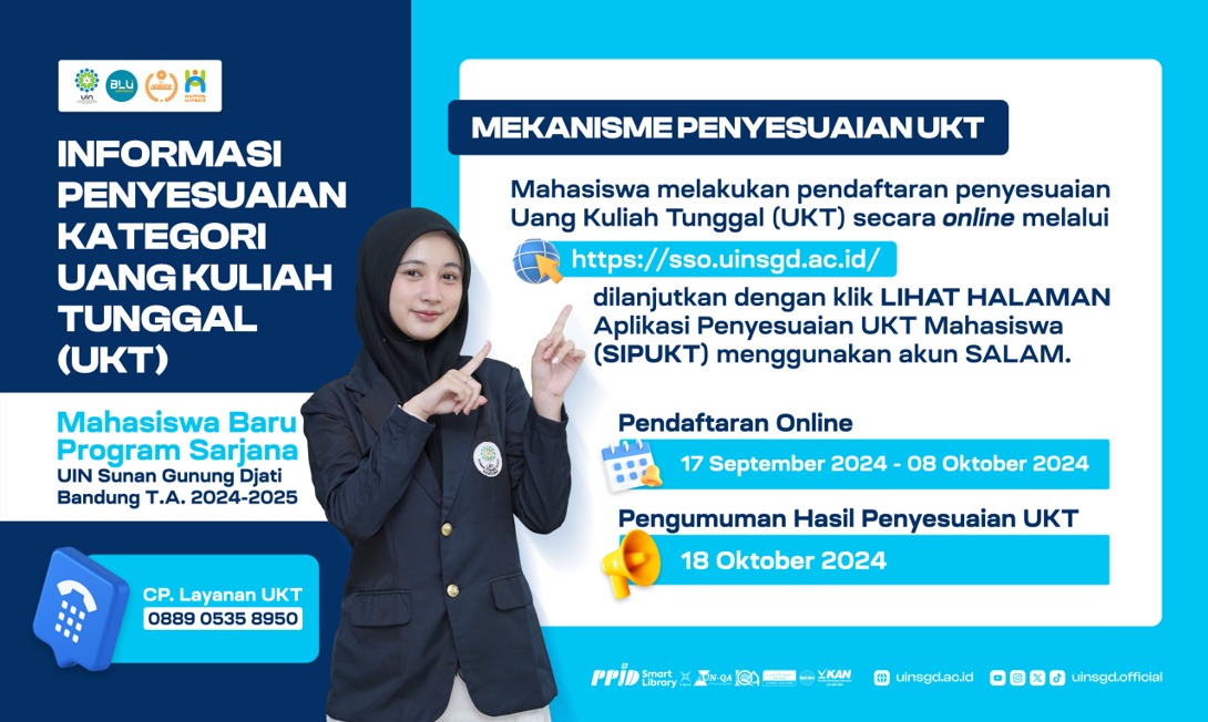 UINSGD.AC.ID (Humas) — Untuk mengetahui Informasi penyesuaian kategori Uang Kuliah Tunggal (UKT) bagi mahasiswa baru Program Sarjana UIN Sunan Gunung Djati Bandung tahun akademik 2024/2025.
