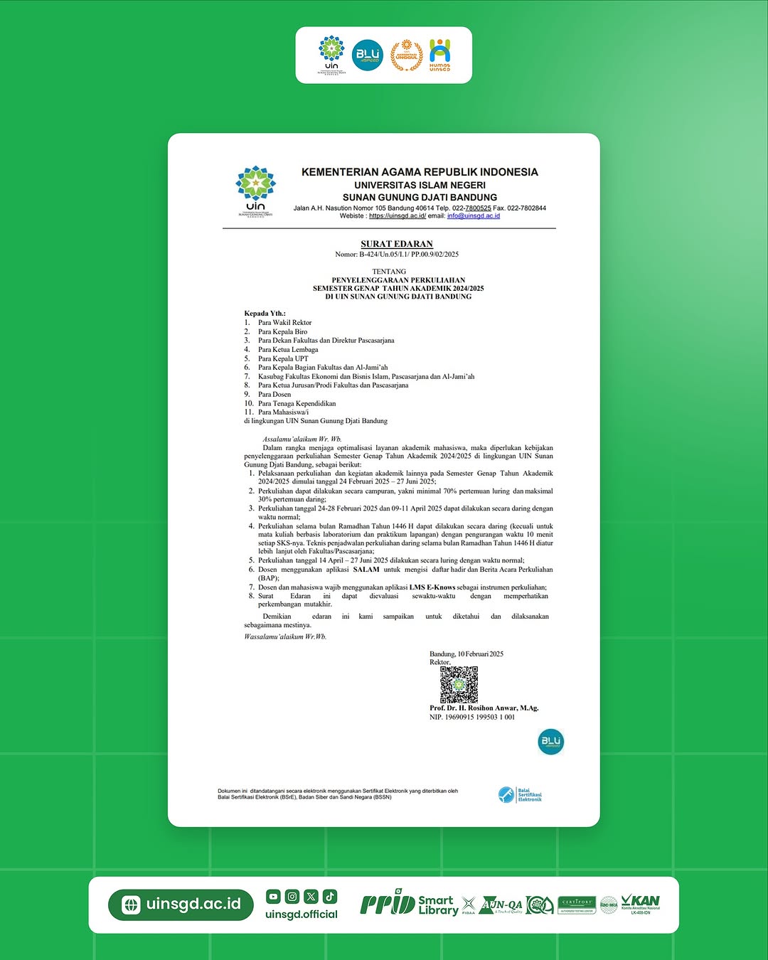 Berdasarkan Surat Edaran Rektor No.B-424/Un.05/I.1/PP.00.9/02/2025 tentang Penyelenggaraan Perkuliahan Sementer Genap Tahun Akademik 2024/2025 di UIN Sunan Gunung Djati Bandung.