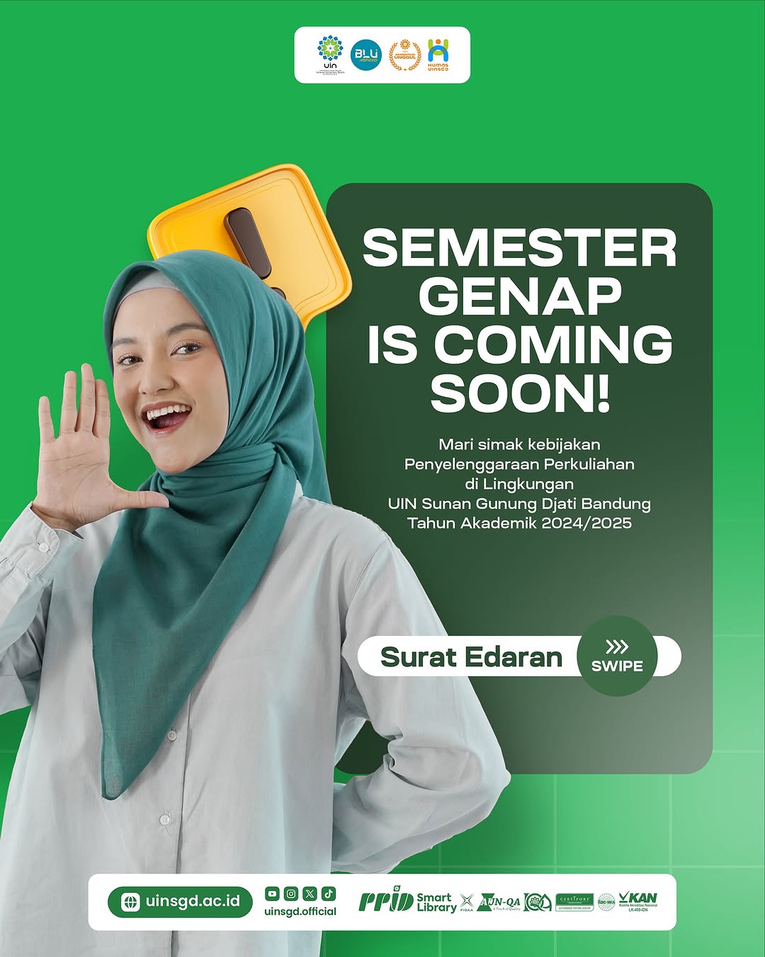 Dalam rangka menjaga optimalisasi layanan akademik mahasiswa, maka diperlukan kebijakan penyelenggaraan perkuliahan Semester Genap Tahun Akademik 2024/2025 di lingkungan UIN Sunan Gunung Djati Bandung, sebagai berikut: