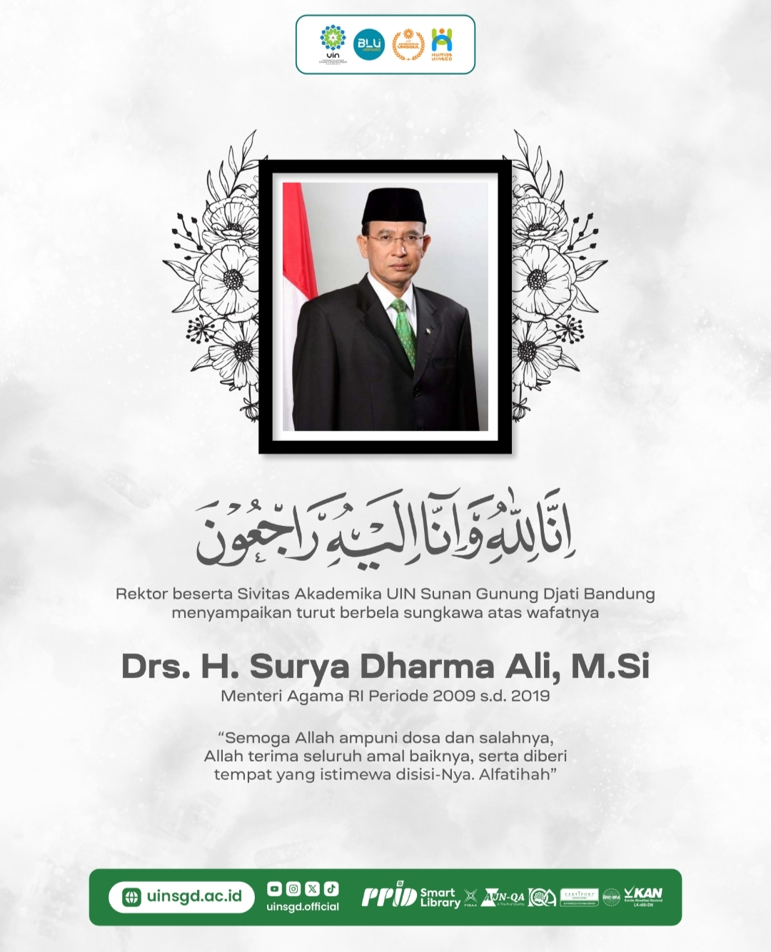 Innalillahi… UIN Sunan Gunung Djati Bandung Berduka Atas Wafatnya Drs. H. Suryadharma Ali, M.Si.