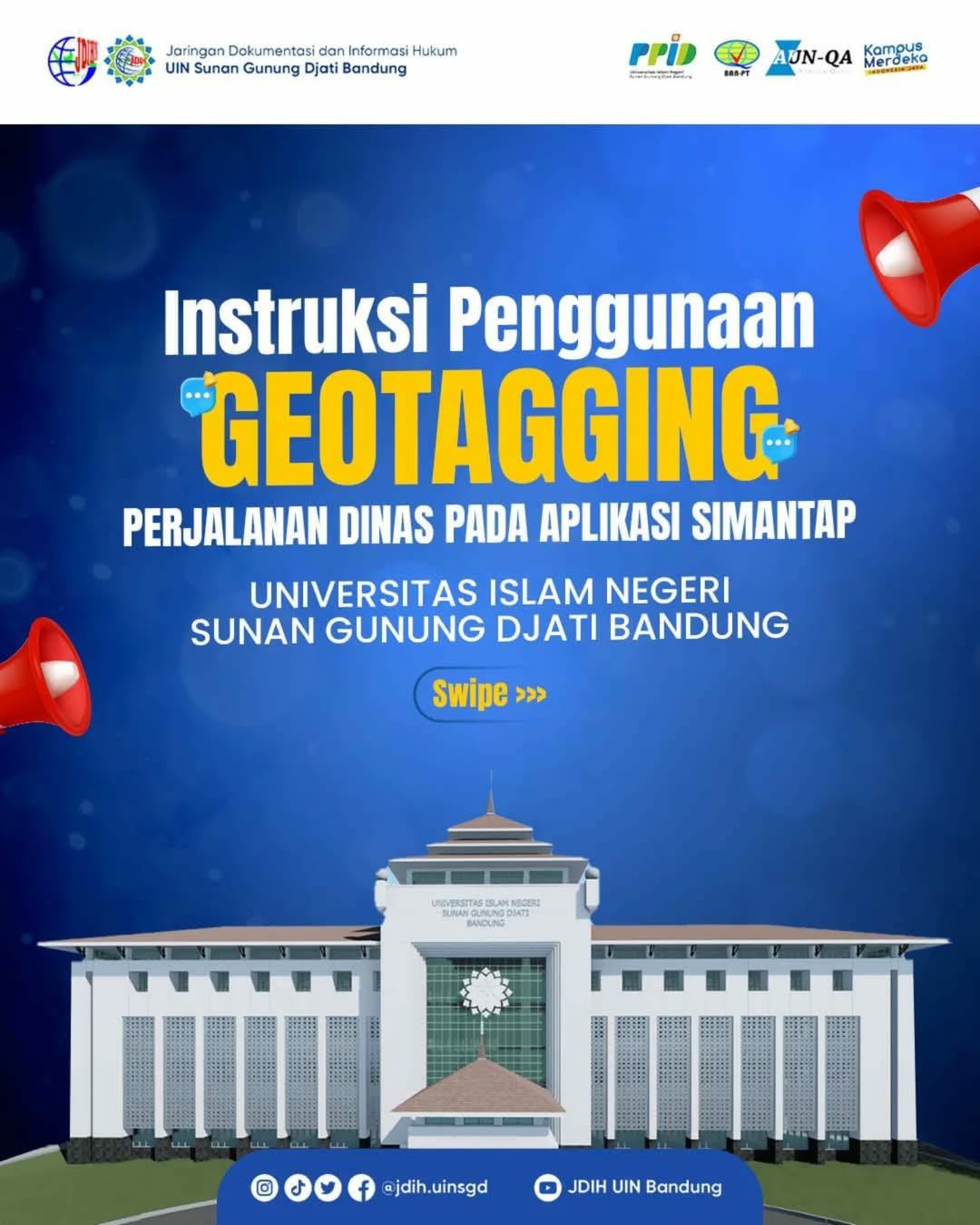 UINSGD.AC.ID (Humas) — Berdasarkan Surat Edaran Rektor UIN Sunan Gunung Djati Bandung Nomor 012/Un.05/II.2/KP.01.1/01/2025 bahwa dalam rangka tertib administrasi perjalanan dinas seluruh pegawai di lingkungan UIN Sunan Gunung Djati Bandung, yang melaksanakan Perjalan Dinas agar Geo Tagging, mengisilaporan perjanan dinas dan mengunggah foto pada aplikasi SIMANTAP.