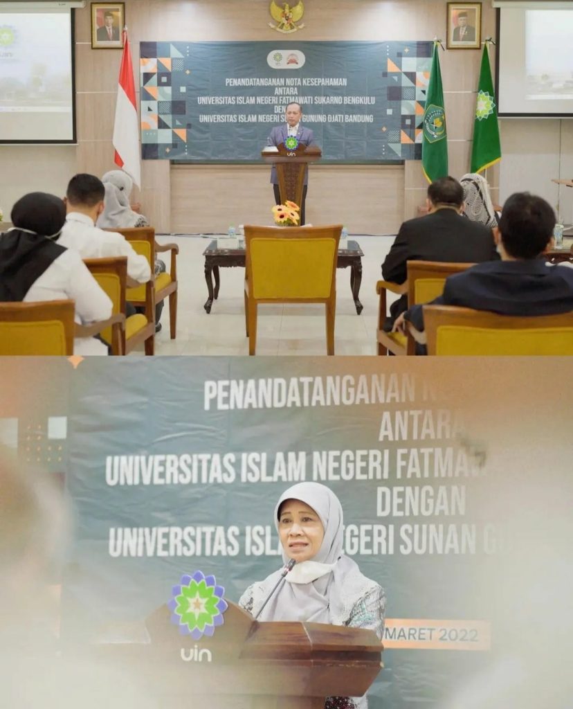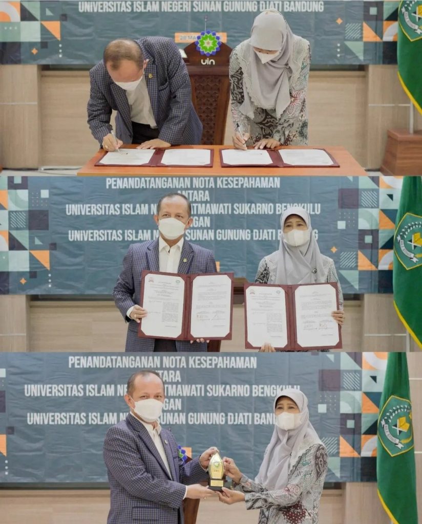 (UINSGD.AC.ID)-Rektor UIN Sunan Gunung Djati Bandung Prof. Dr. H. Mahmud M.Si. CSEE, didampingi Wakil Rektor IV, Prof. Dr. Hj. Ulfiah, M.Si menerima Kunjungan Kerja dan melakukan Penandatanganan Nota Kesepahaman dengan Wakil Rektor III UIN Fatmawati Sukarno Bengkulu, Dr. Fatimah, MA., yang berlangsung di Gedung O.Djauharuddin AR, Senin (28/03/2022).