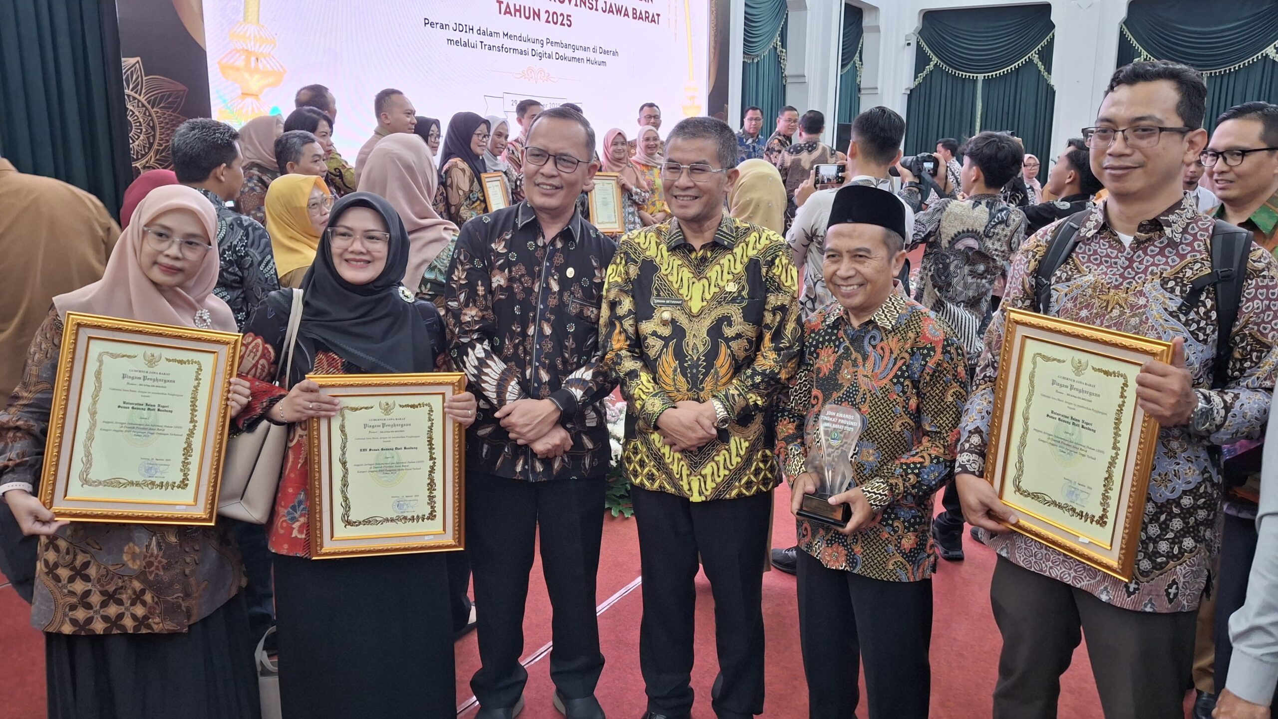 UINSGD.AC.ID (Humas) — Jaringan Dokumentasi dan Informasi Hukum (JDIH) UIN Sunan Gunung Djati Bandung meraih tiga penghargaan pada Pertemuan dan Pemberian Penghargaan Anggota JDIH Tingkat Provinsi Jawa Barat Tahun 2025 yang diselenggarakan Pemerintah Daerah Provinsi Jawa Barat di Aula Timur Gedung Sate Bandung, Senin (29/9/2025).