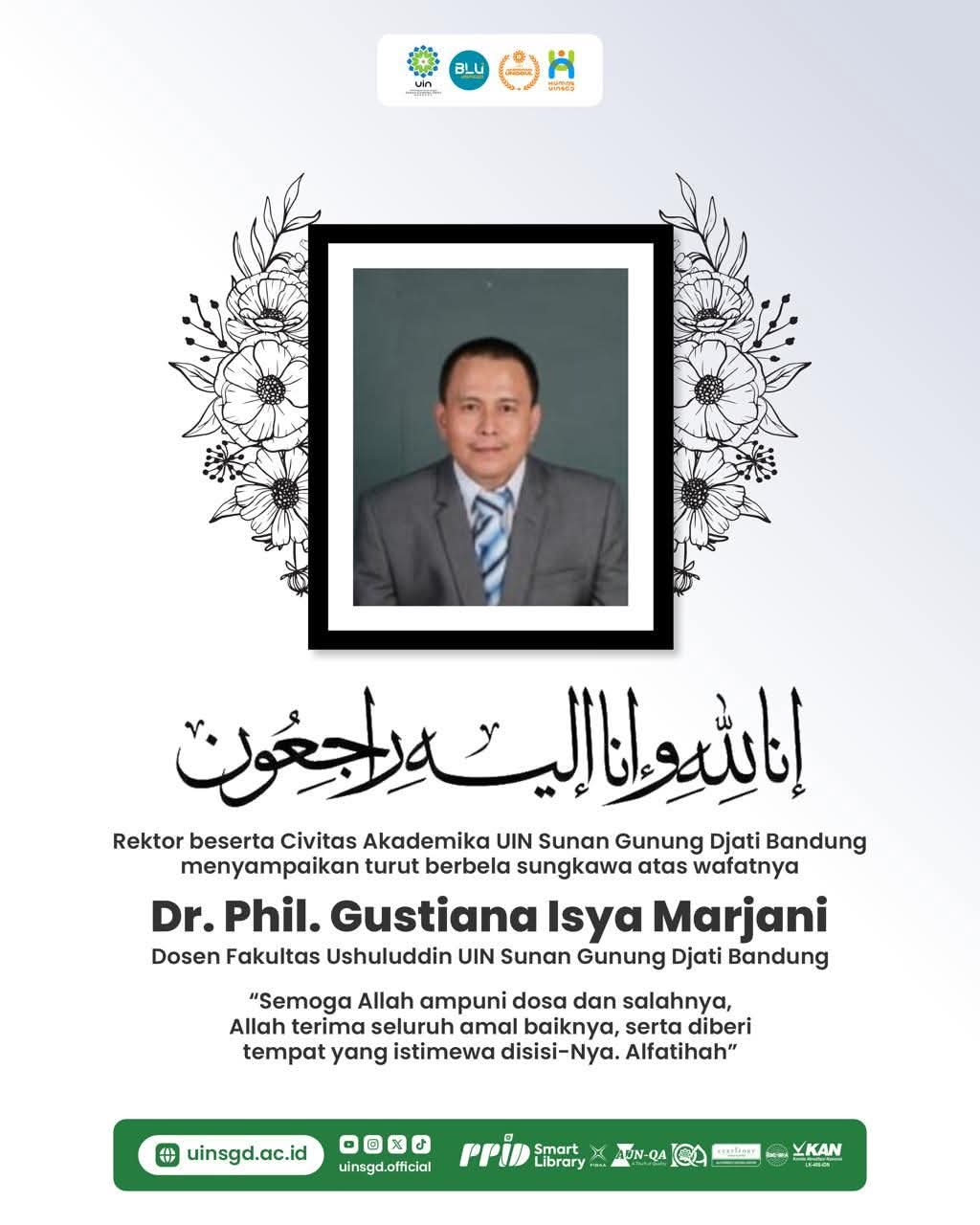 Rektor beserta seluruh civitas akademika Universitas Islam Negeri (UIN) Sunan Gunung Djati Bandung menyampaikan turut berduka cita yang sedalam-dalamnya atas berpulangnya ke Rahmatullah Gustiana Isya Marjani, Ph.D., Dosen Studi Agama-Agama Fakultas Ushuluddin pada hari Jumat tanggal 24 Januari 2025.