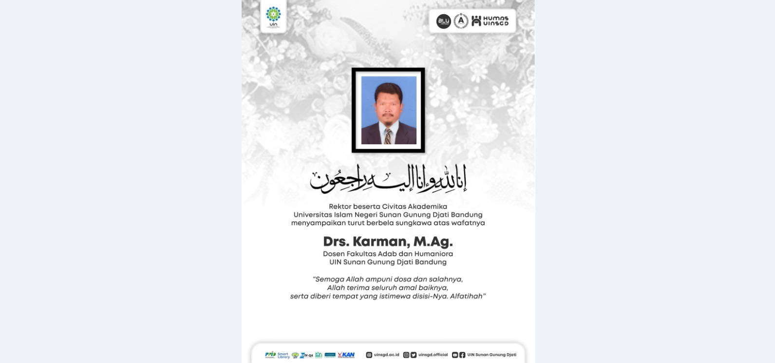 (UINSGD.AC.ID)-Rektor beserta seluruh Civitas Akademika Universitas Islam Negeri (UIN) Sunan Gunung Djati Bandung menyampaikan turut berduka cita yang sedalam-dalamnya atas berpulangnya ke Rahmatullah Drs. Karman, M.Ag., Dosen Fakultas Adab dan Humaniora (FAH) hari Jumat (12/5/2023) di Rumah Sakit Dokter Hasan Sadikin Bandung.