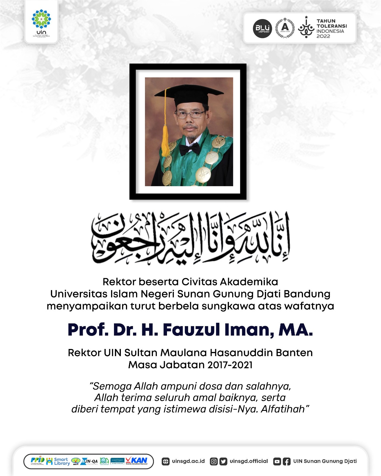 (UINSGD.AC.ID)-Rektor beserta seluruh Civitas Akademika Universitas Islam Negeri (UIN) Sunan Gunung Djati Bandung menyampaikan turut berduka cita yang sedalam-dalamnya atas berpulangnya ke Rahmatullah Prof Dr H Fauzul Iman M.A, Rektor UIN Sultan Maulana Hasanudin (SMH) Banten Periode 2017-2021 pada hari Jumat (10/2/2023) di Rumah Sakit Jakarta Pusat.