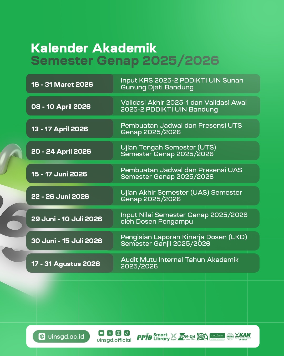 Berikut kami informasikan Kalender Akademik Semester Genap Tahun Akademik 2025/2026 UIN Sunan Gunung Djati Bandung. Kamu bisa akses lengkapnya di sini: